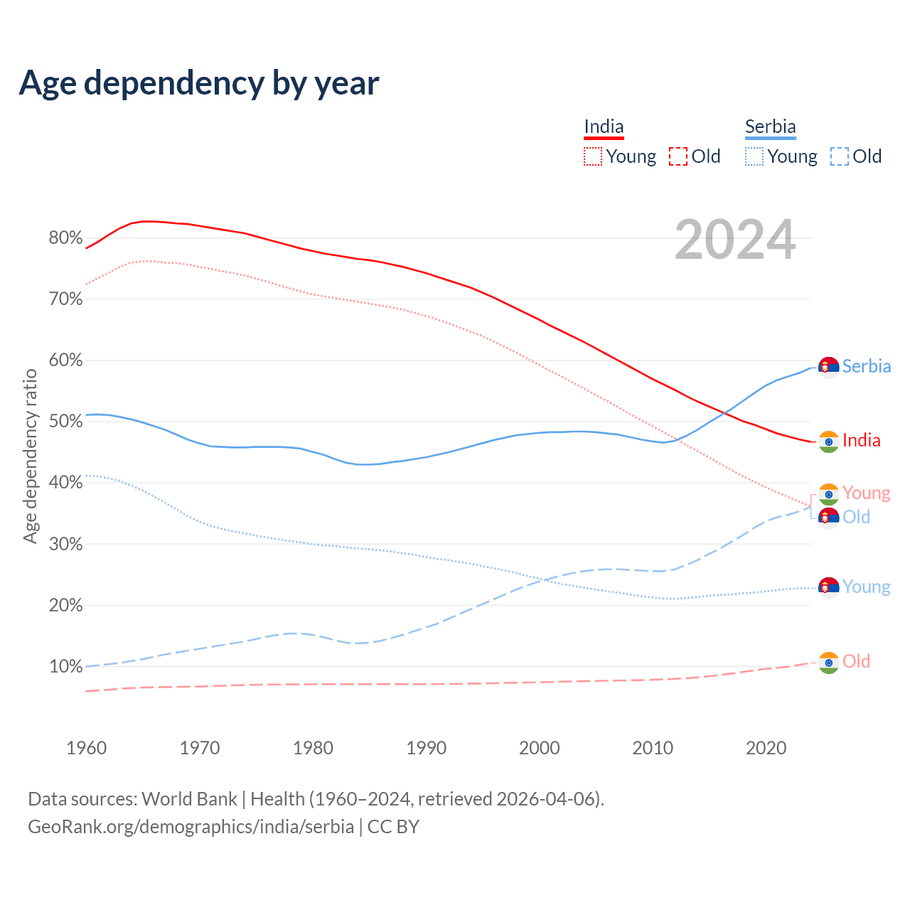 - India is ranked 108/196 by median age (oldest to youngest) vs 15/196 for Serbia.