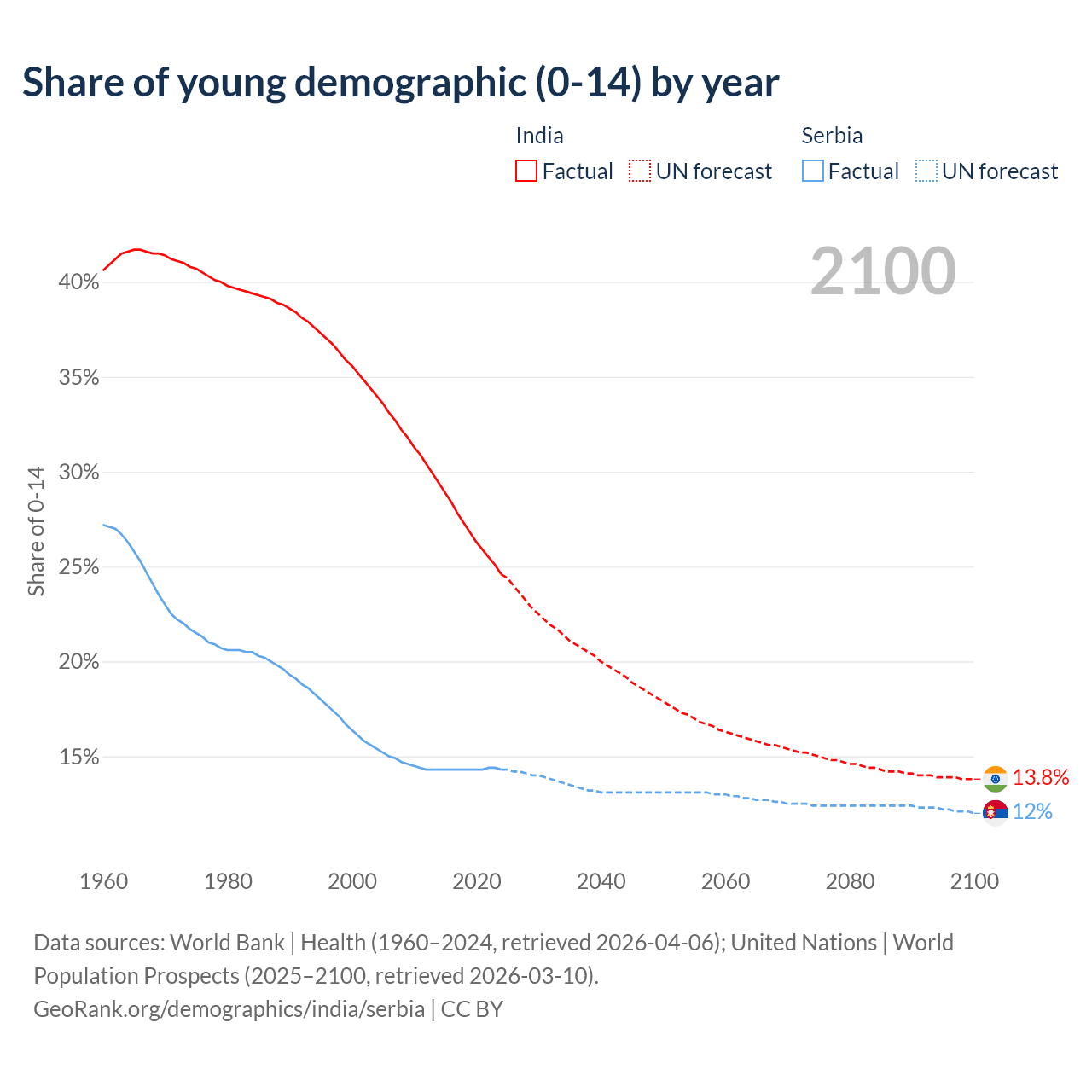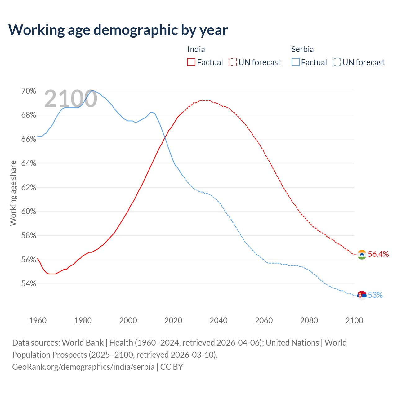 Median age India vs Serbia, 1960-2100