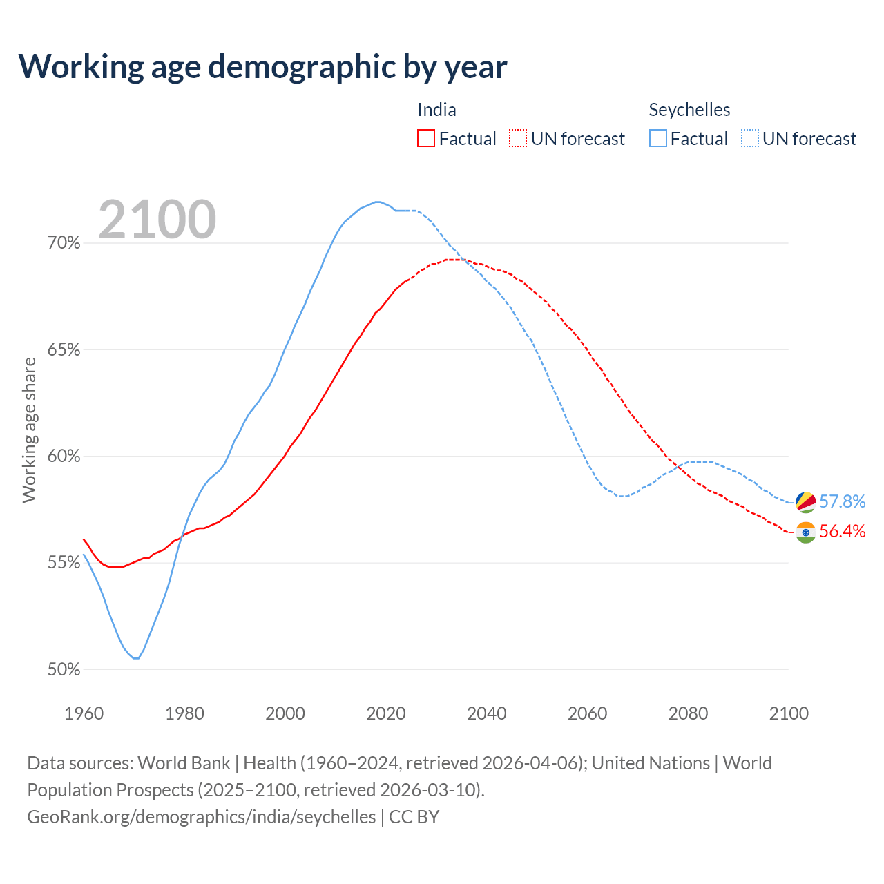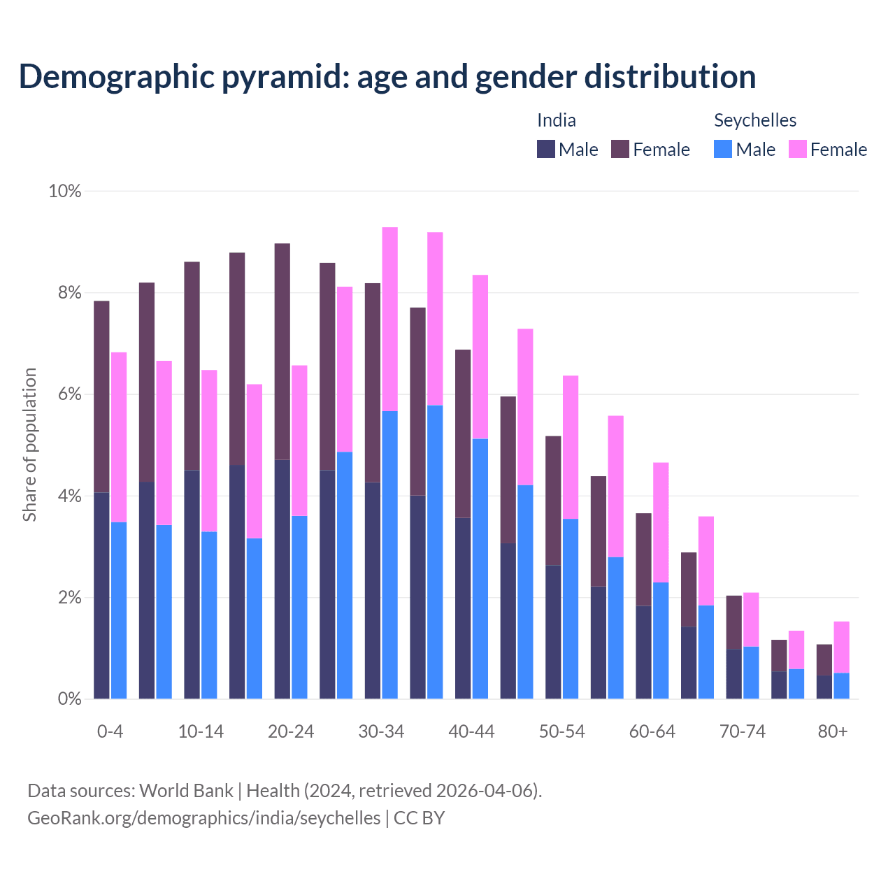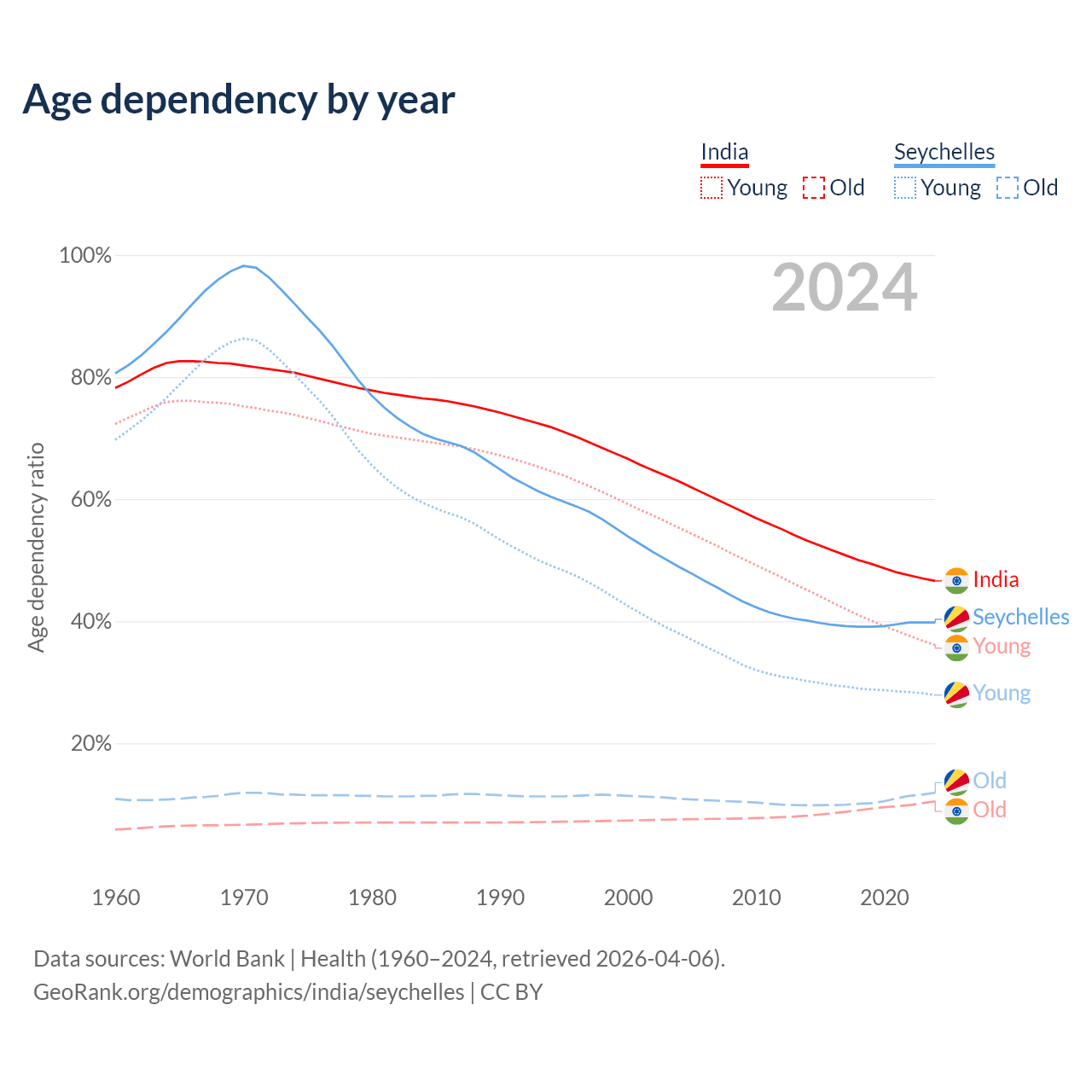 - India is ranked 108/196 by median age (oldest to youngest) vs 76/196 for the Seychelles.