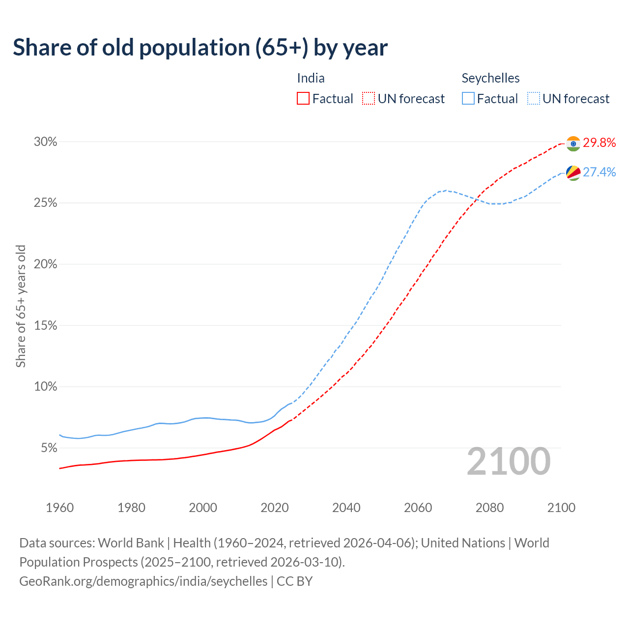 - The share of old-age demographic (65+) in India is 7.15% vs 8.54% in the Seychelles.