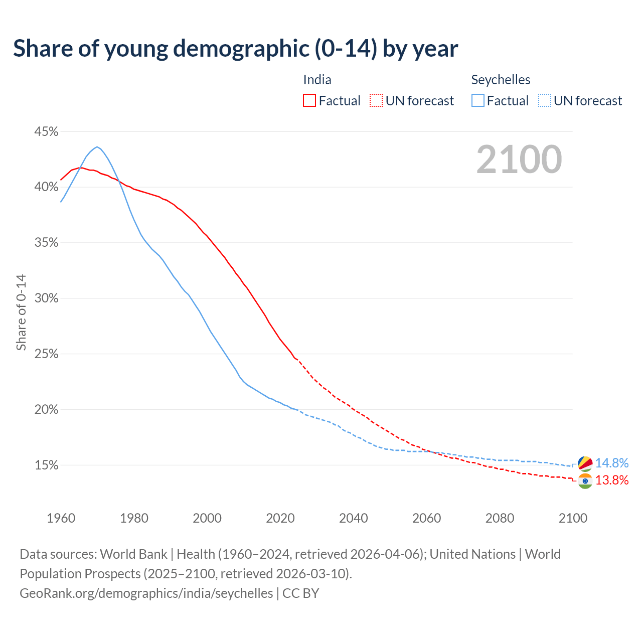 - The share of young demographic (0-15 years old) in India is 24.6% vs 20% in the Seychelles.