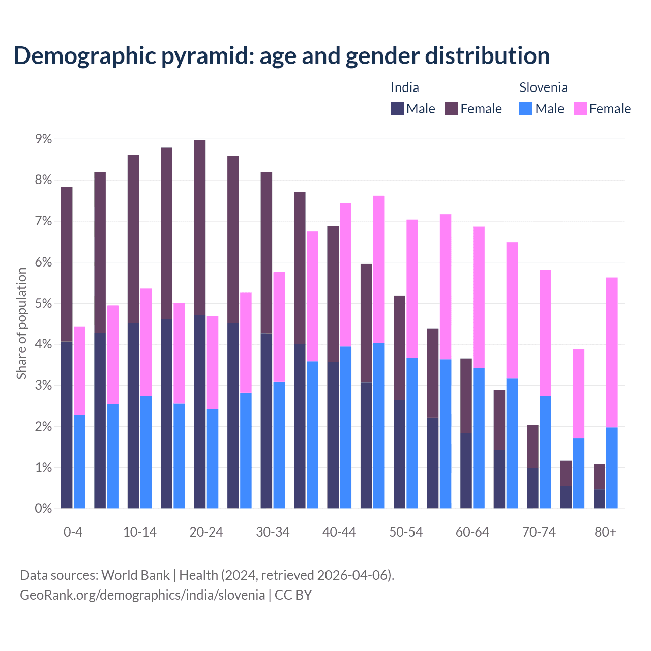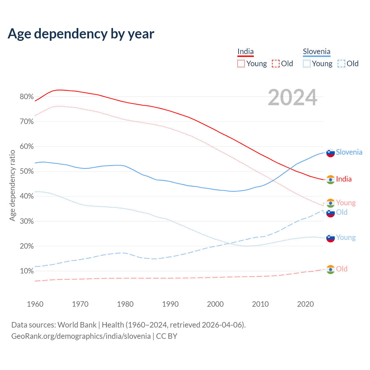 - India is ranked 108/196 by median age (oldest to youngest) vs 14/196 for Slovenia.