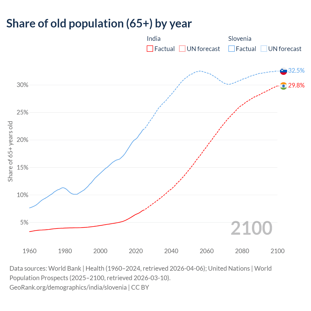 The share of older people aged 65 and over is 7.15% in India and 21.8% in Slovenia. Life expectancy in India compared to Slovenia .