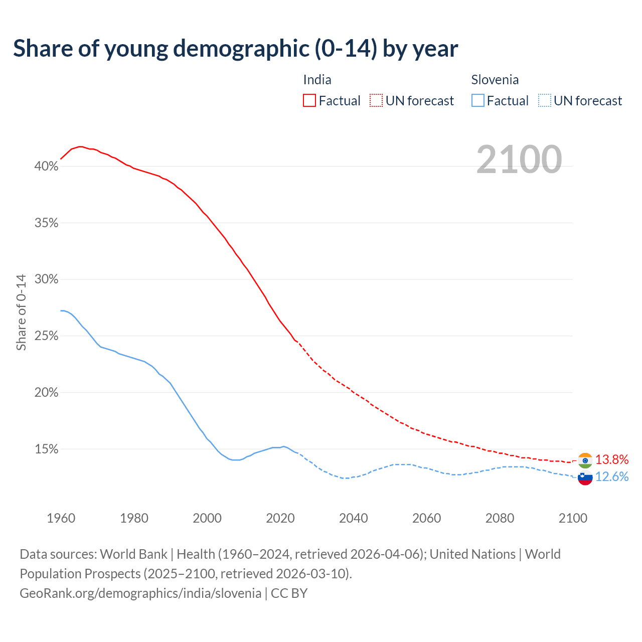 - The share of young demographic (0-15 years old) in India is 24.6% vs 14.7% in Slovenia.