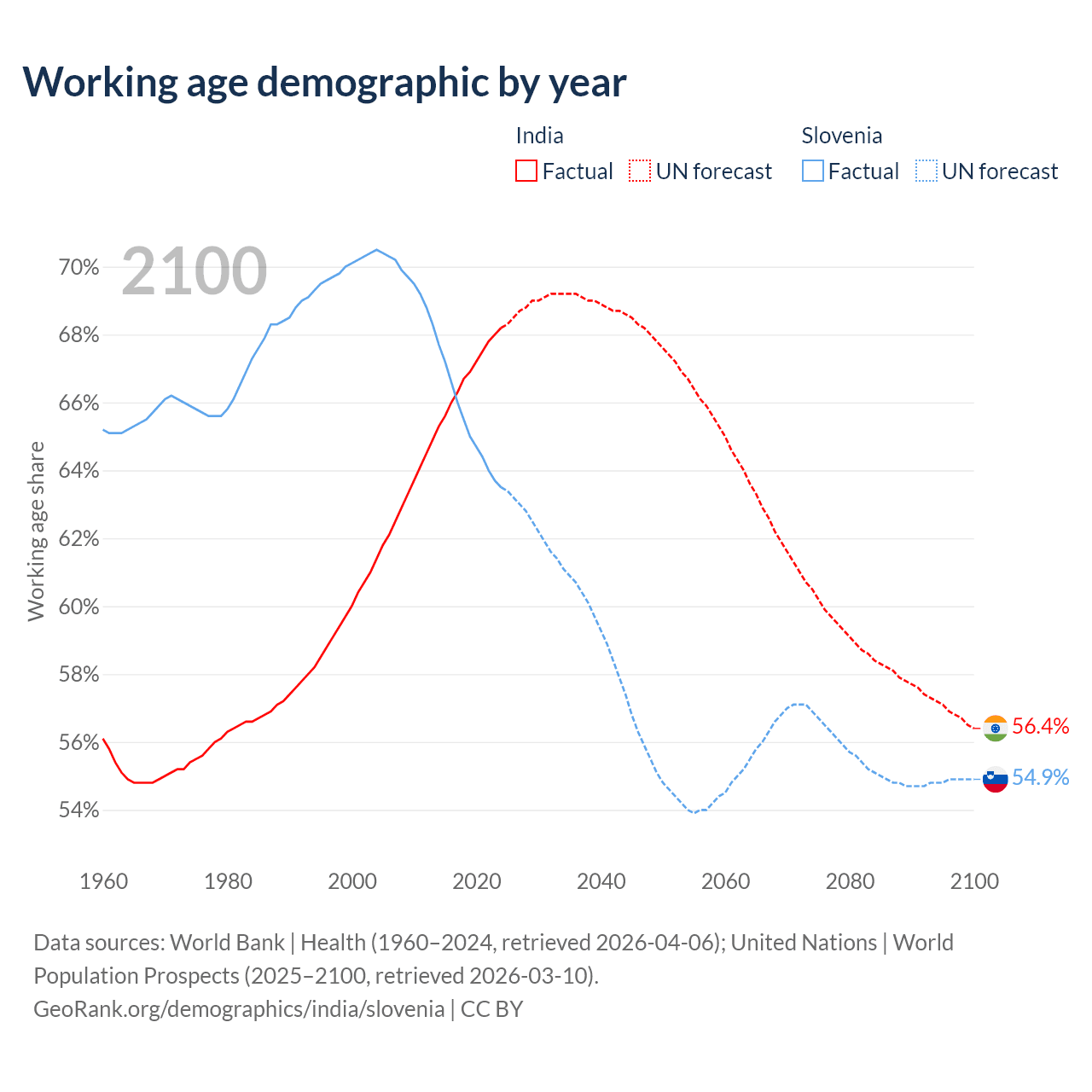 Median age India vs Slovenia, 1960-2100