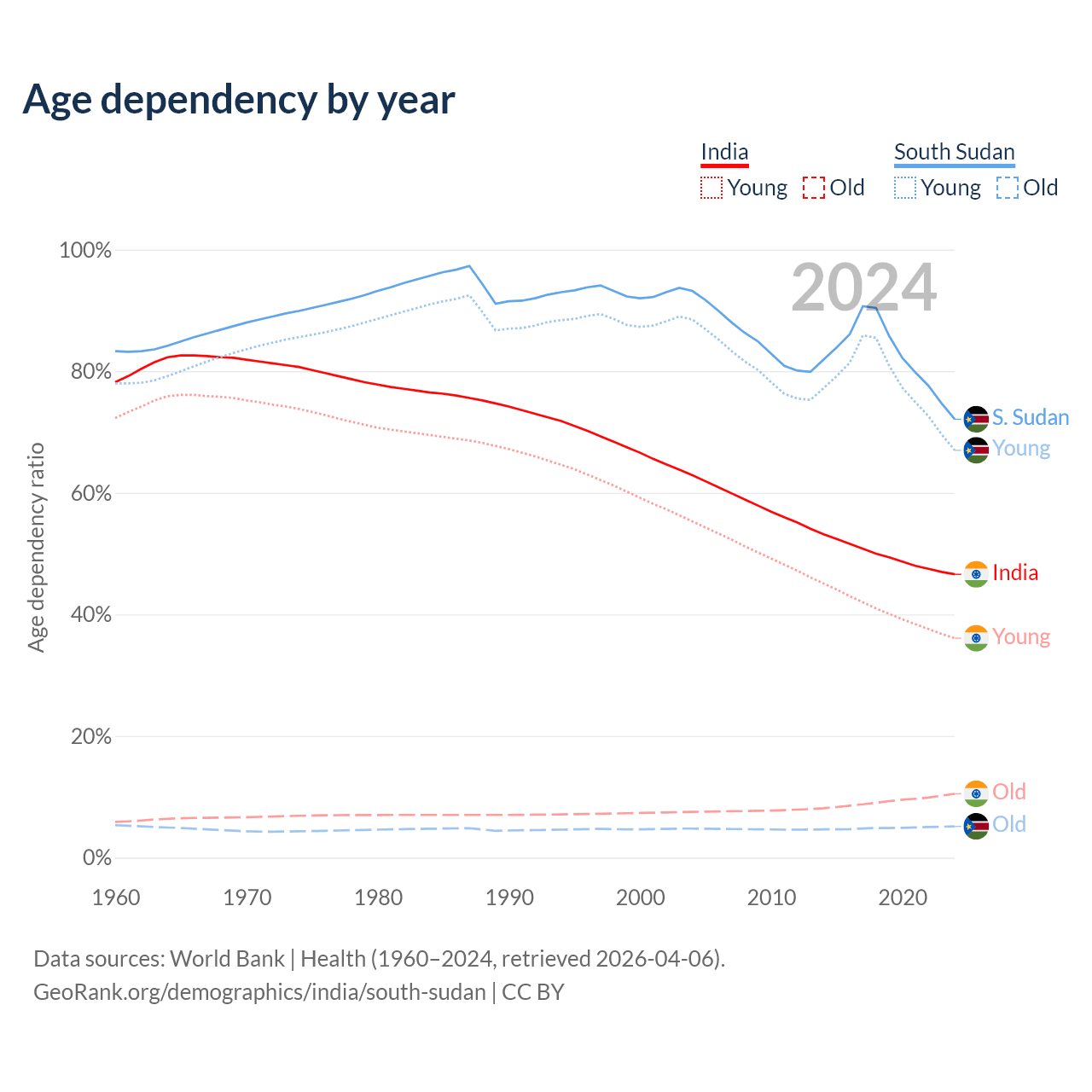 - India is ranked 108/196 by median age (oldest to youngest) vs 173/196 for South Sudan.