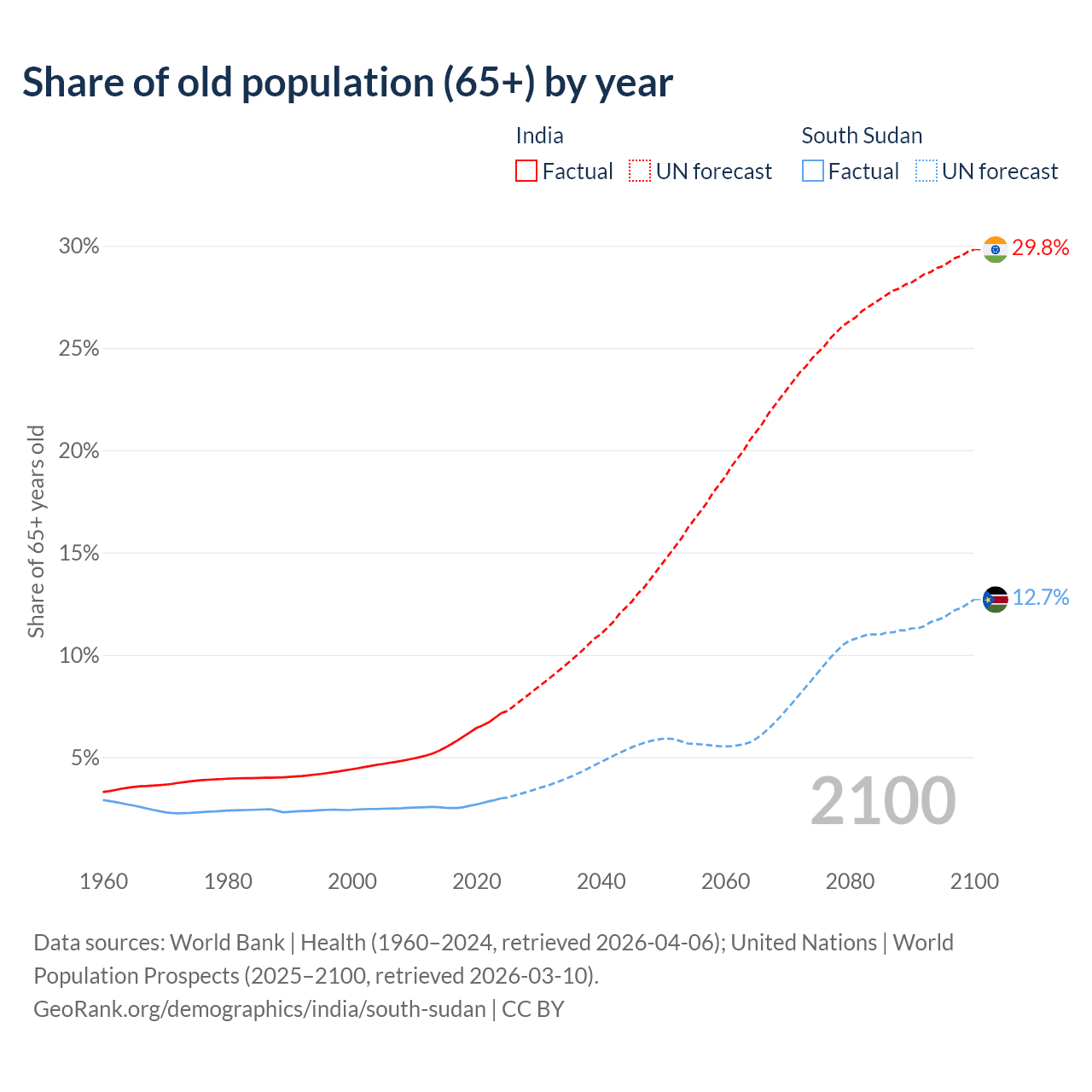 - The share of old-age demographic (65+) in India is 7.15% vs 2.99% in South Sudan.