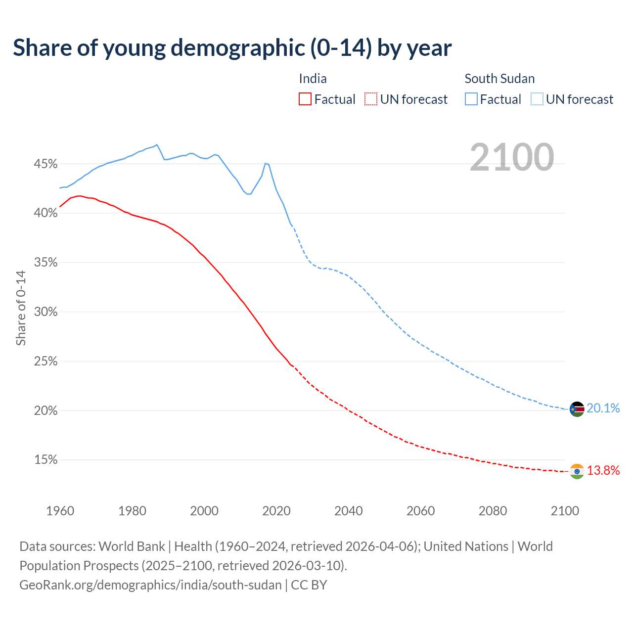 - The share of young demographic (0-15 years old) in India is 24.6% vs 38.9% in South Sudan.