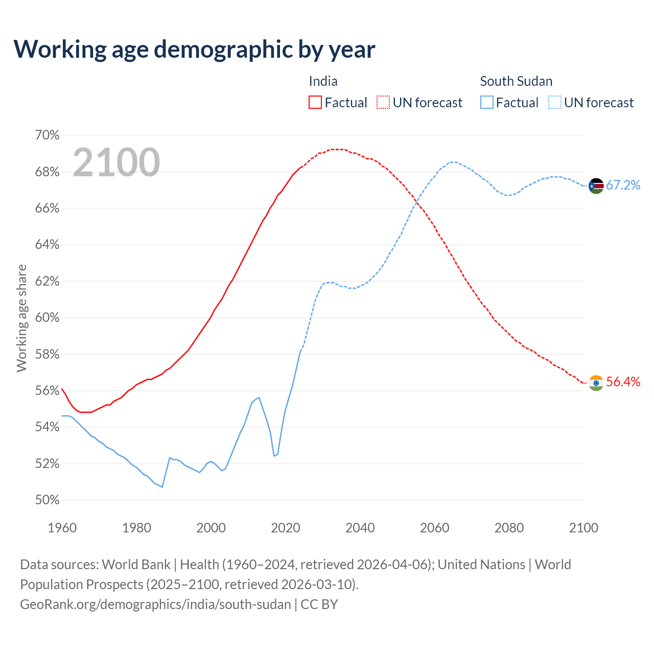 - India has 1.01B working age adults (aged 15-64) vs 7.27M in South Sudan.