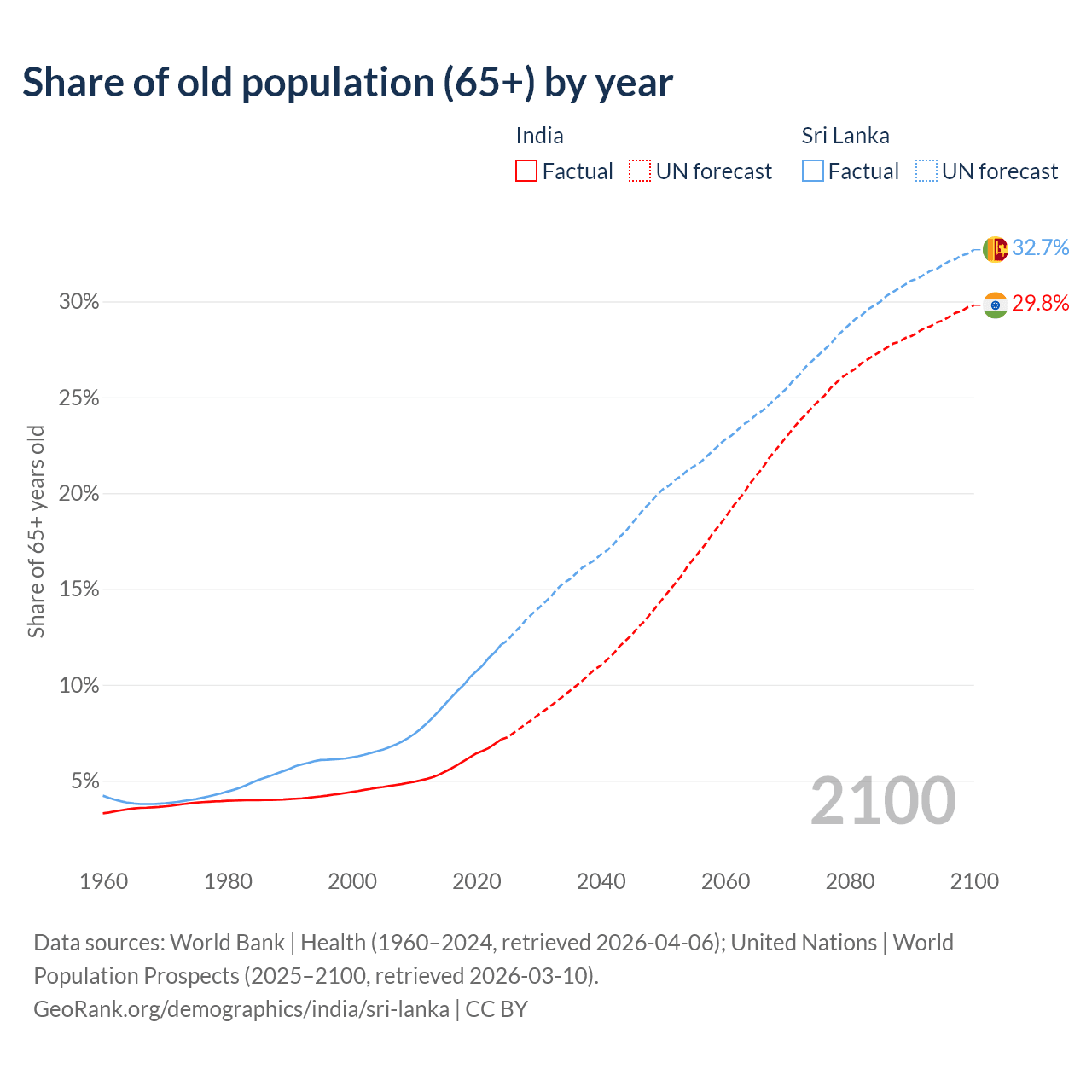 The share of older people aged 65 and over is 7.15% in India and 12.1% in Sri Lanka. Life expectancy in India compared to Sri Lanka .