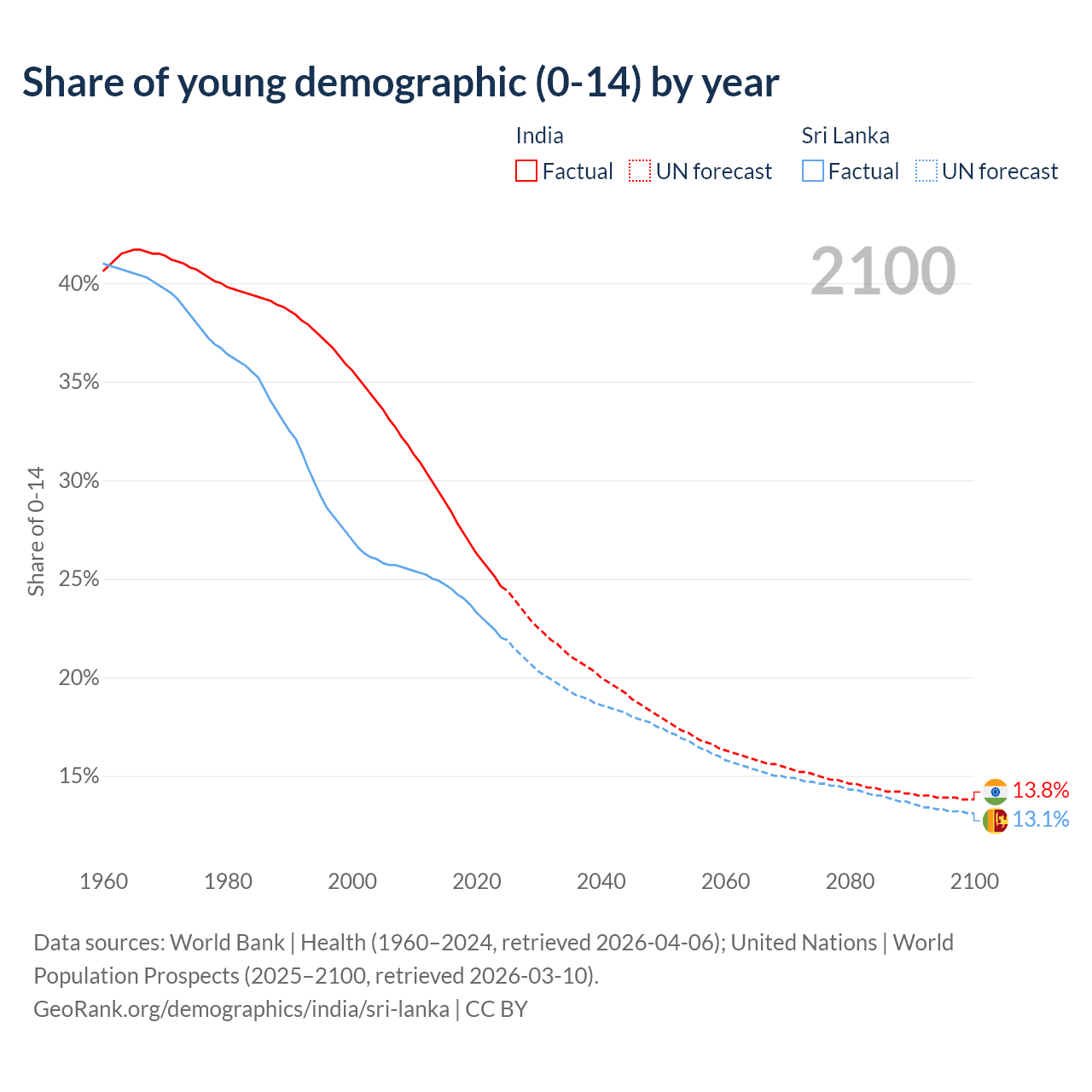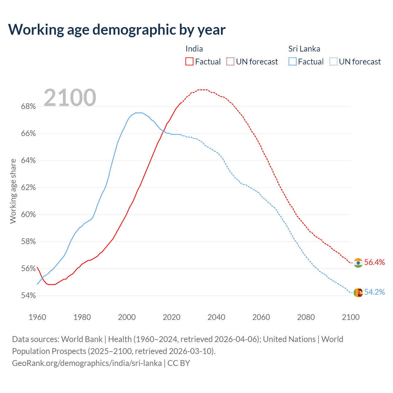 Median age India vs Sri Lanka, 1960-2100