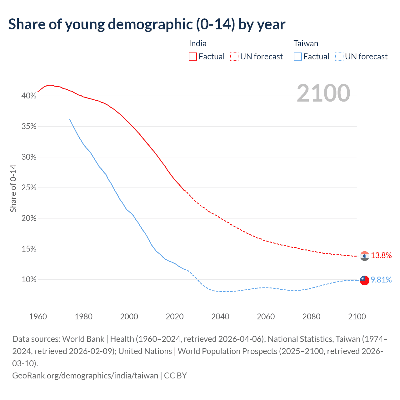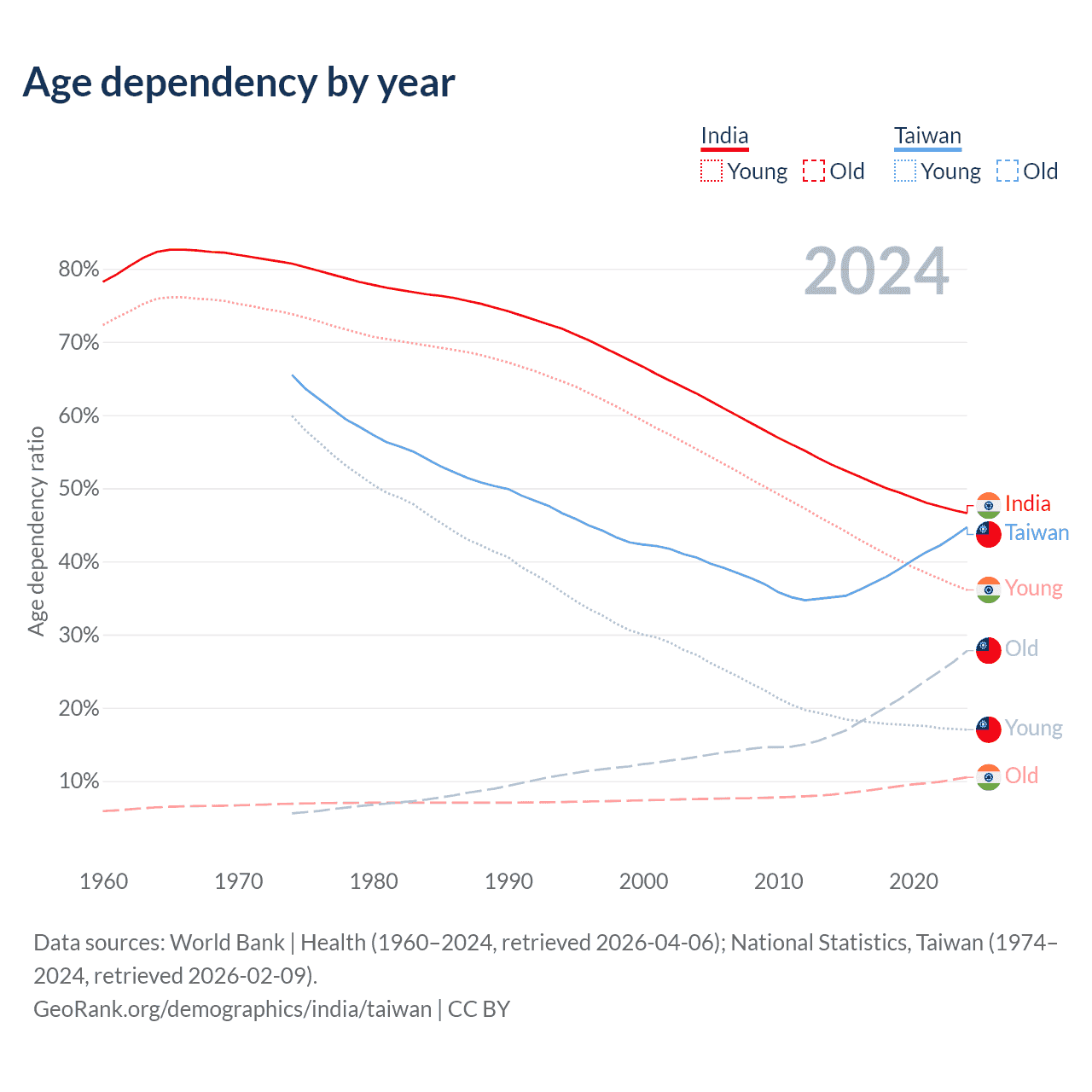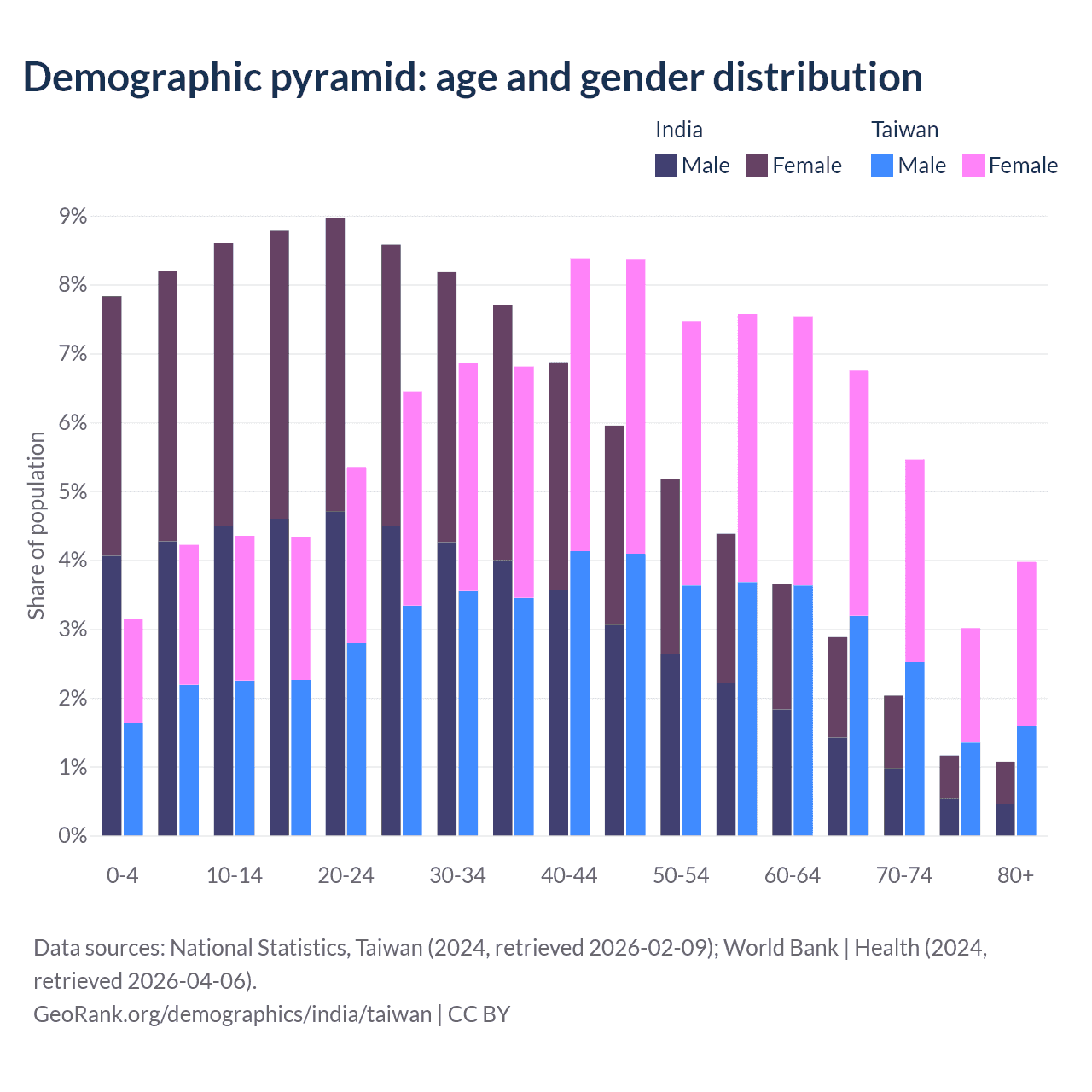 - India is ranked 108/196 by median age (oldest to youngest) vs 16/196 for Taiwan.