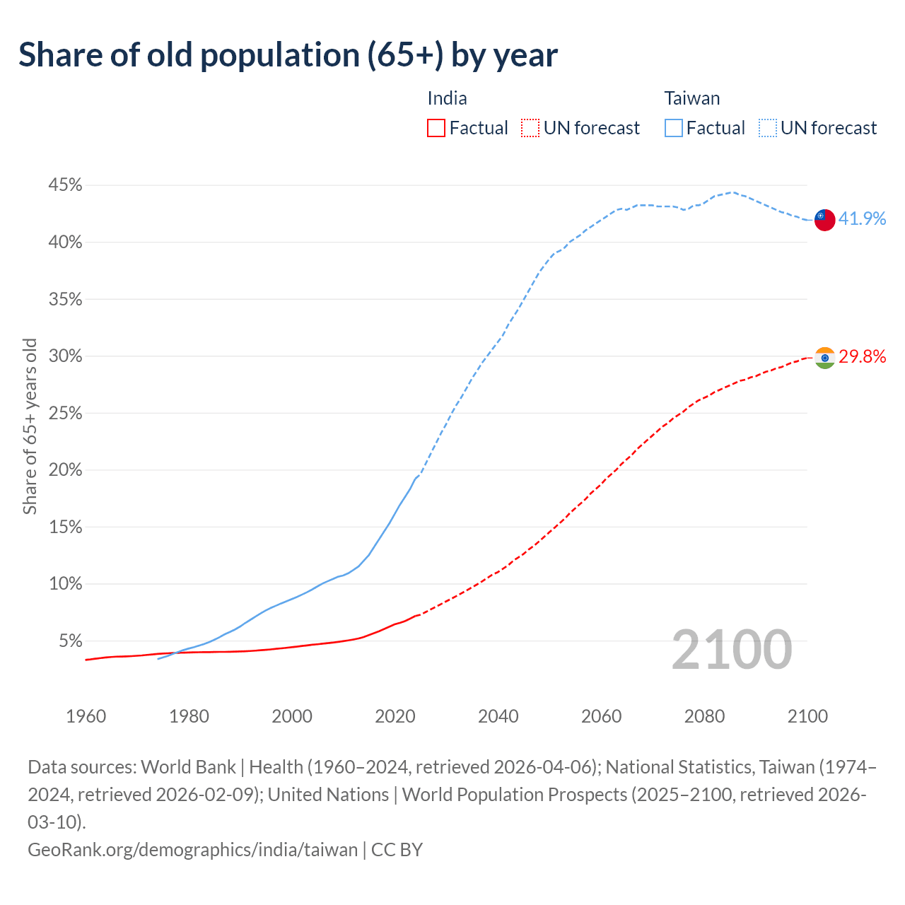 The share of older people aged 65 and over is 7.15% in India and 19.2% in Taiwan. Life expectancy in India compared to Taiwan .