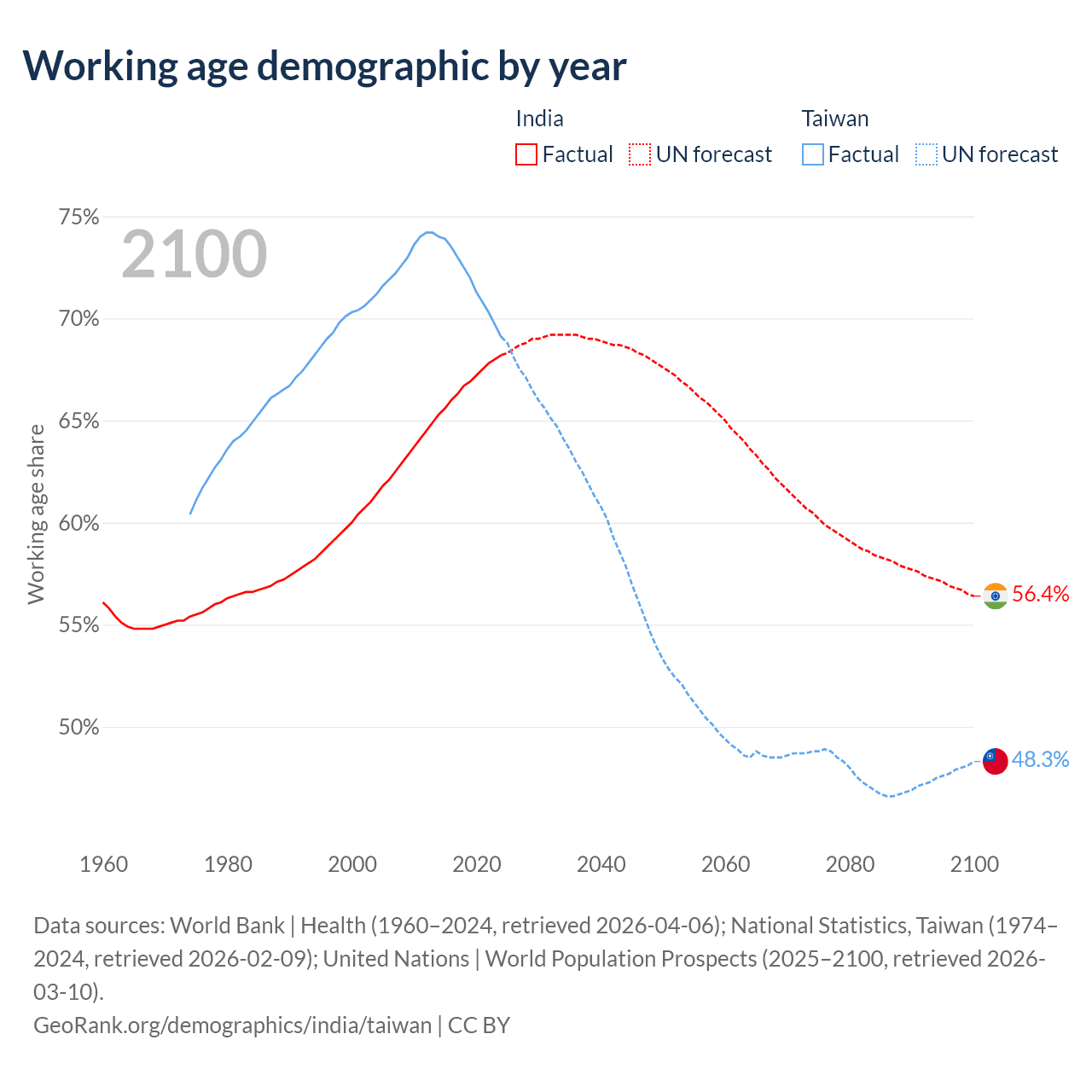 - India has 1.01B working age adults (aged 15-64) vs 16.1M in Taiwan.