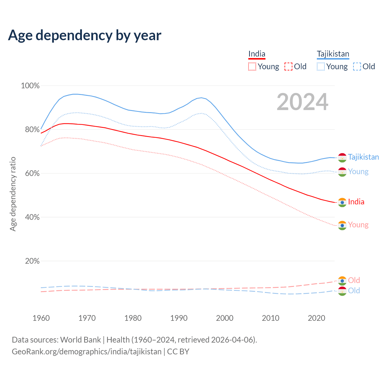 - India is ranked 108/196 by median age (oldest to youngest) vs 142/196 for Tajikistan.