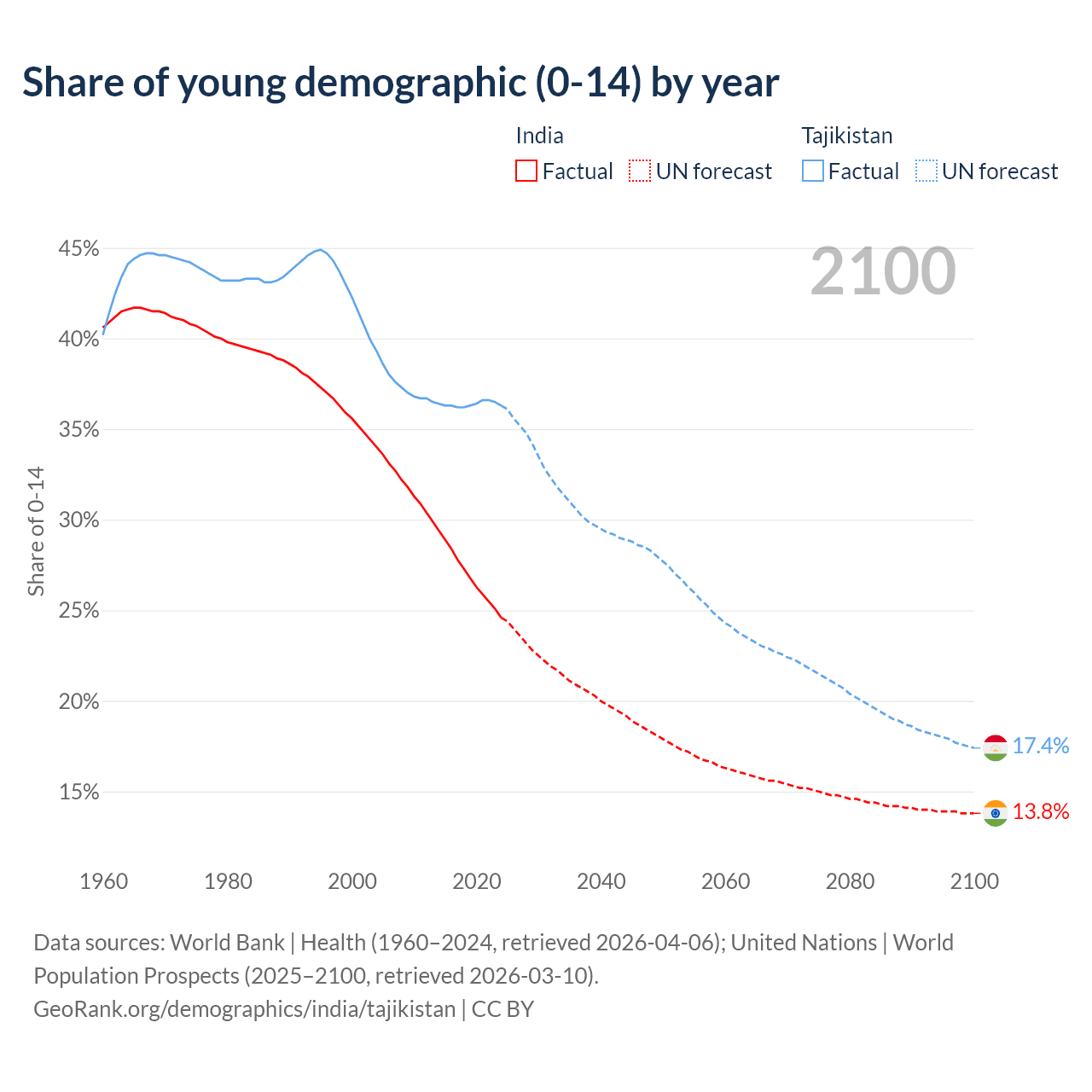 - The share of young demographic (0-15 years old) in India is 24.6% vs 36.3% in Tajikistan.