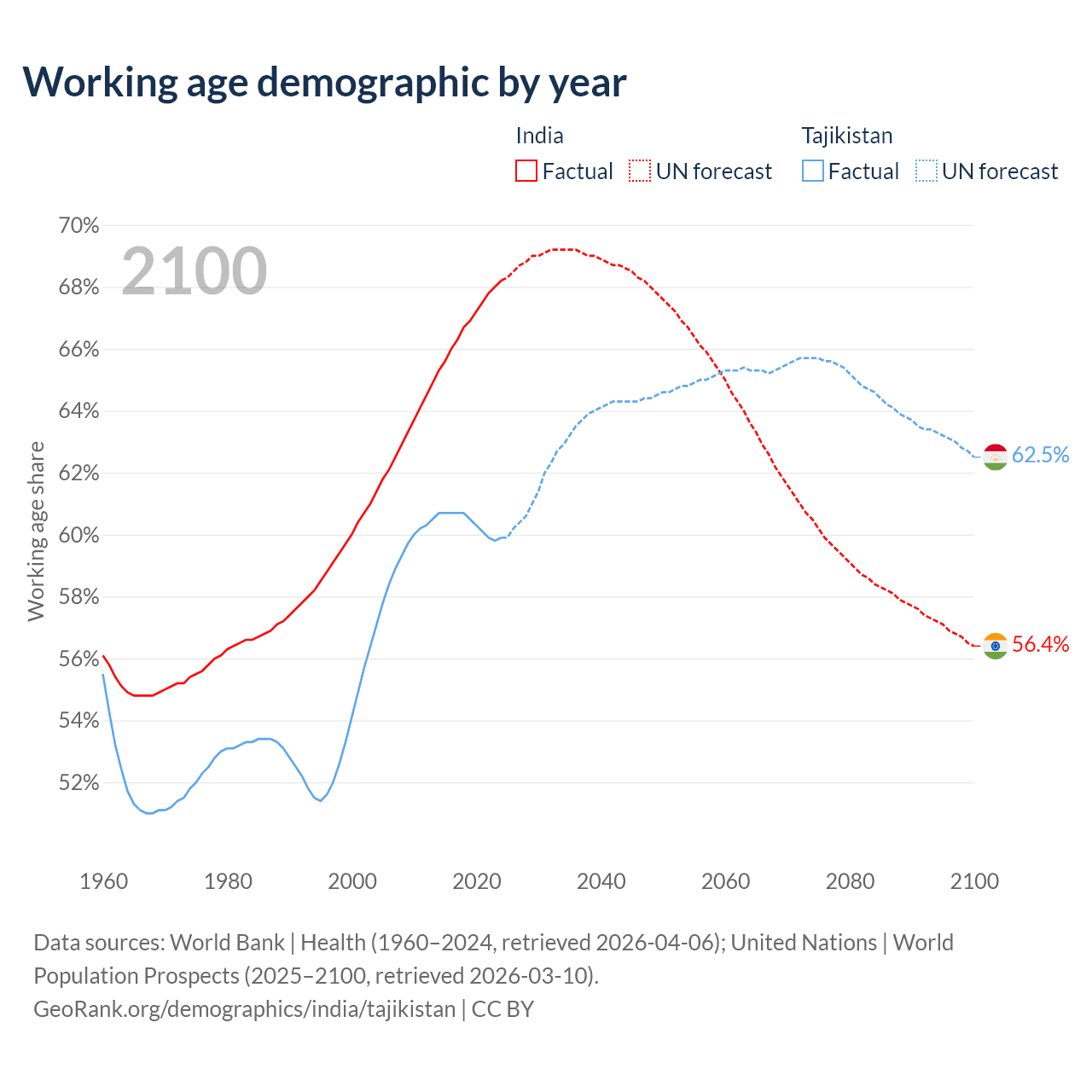 - India has 1.01B working age adults (aged 15-64) vs 6.61M in Tajikistan.