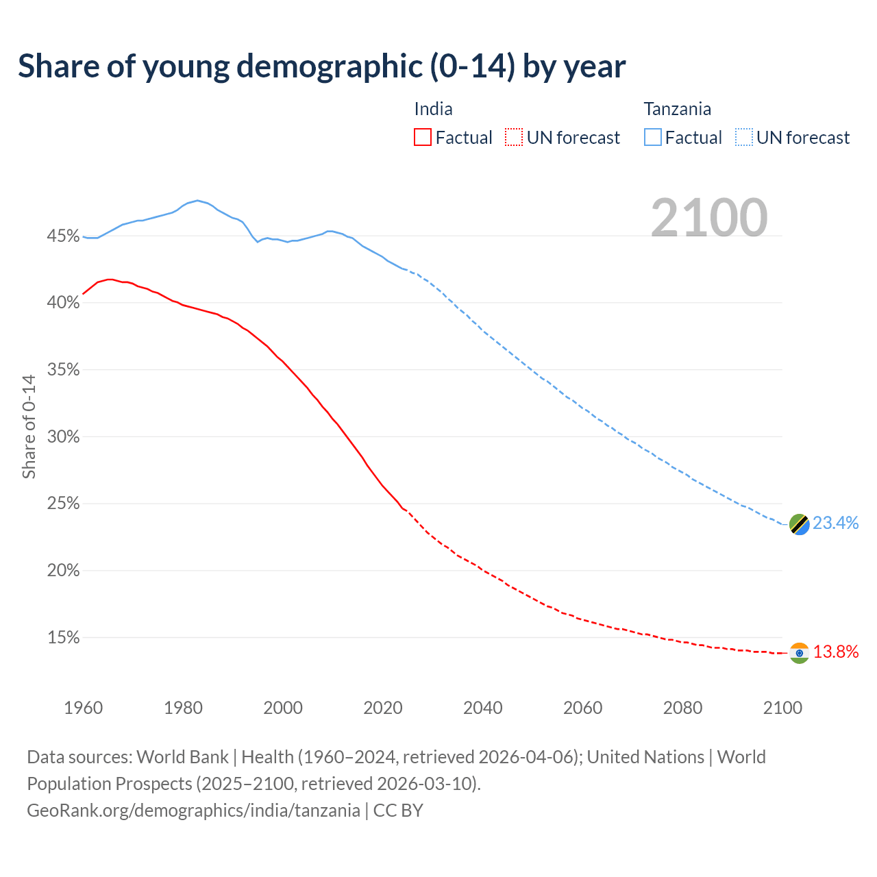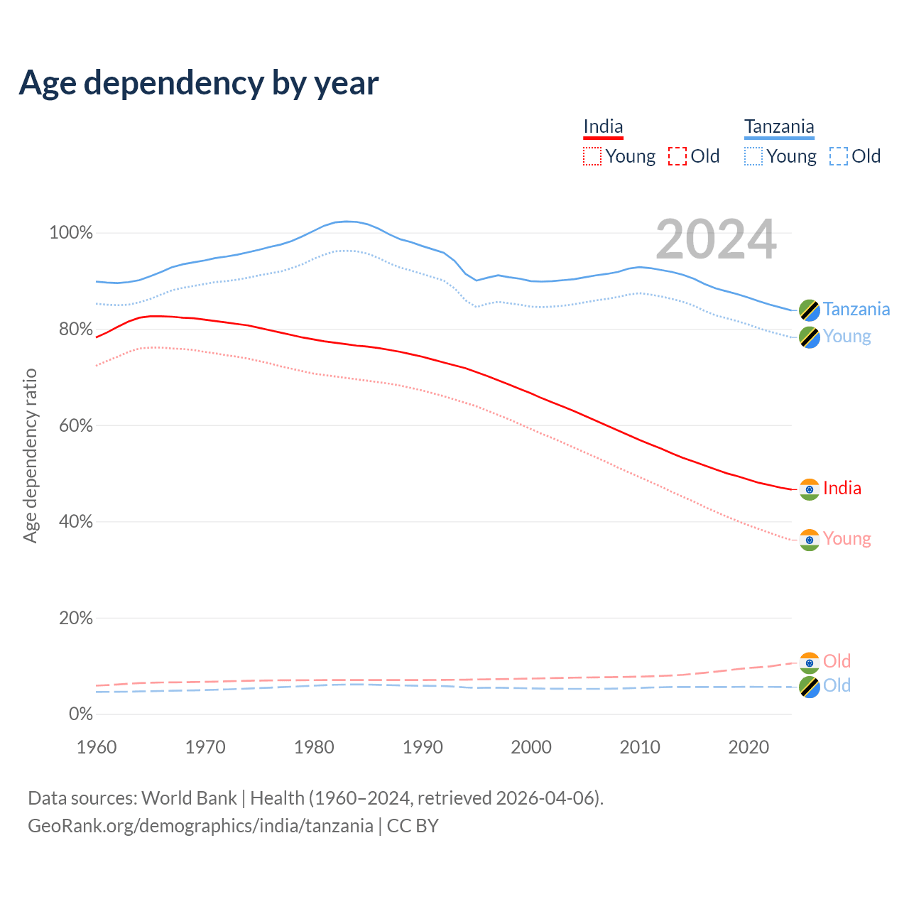 - India is ranked 108/196 by median age (oldest to youngest) vs 184/196 for Tanzania.