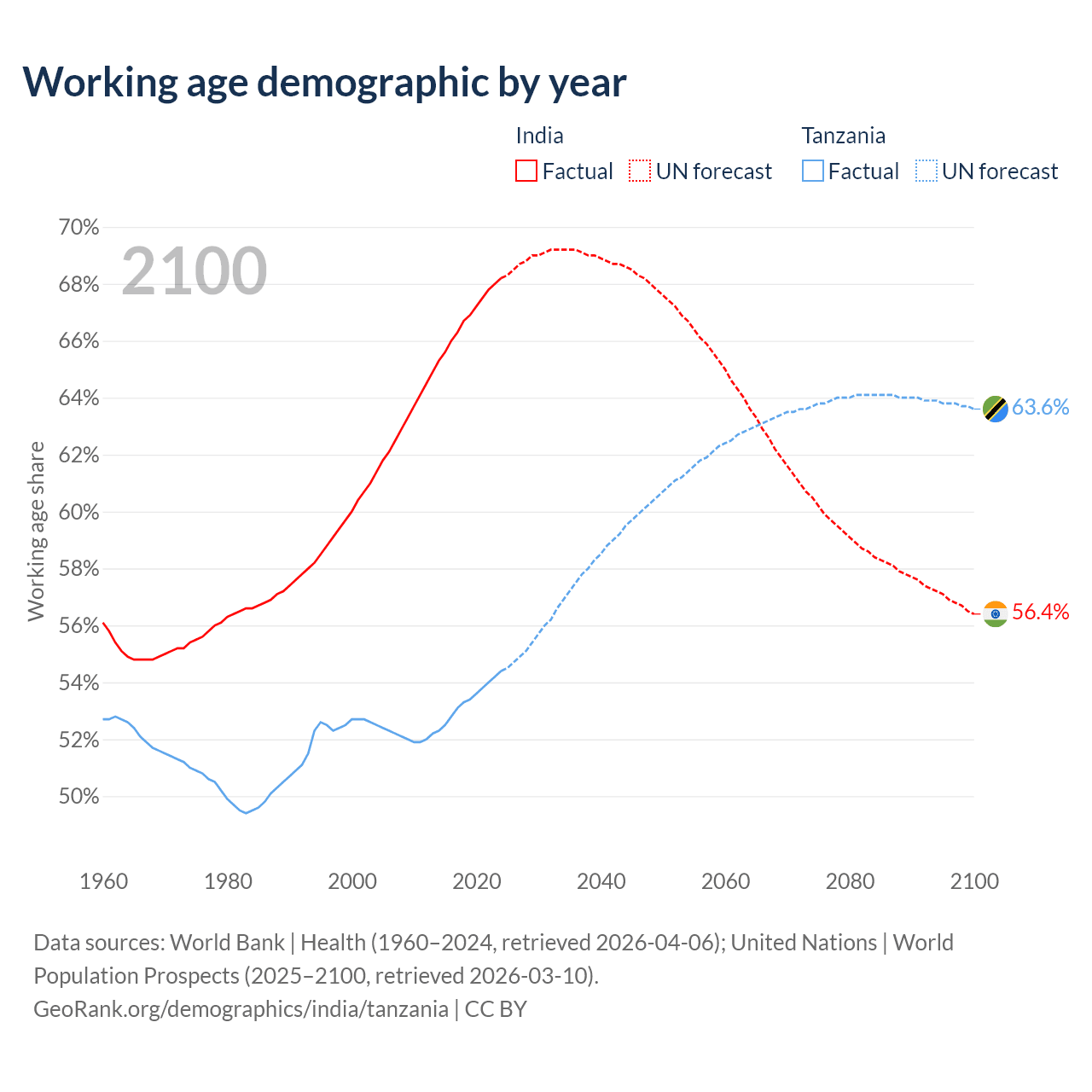 - India has 1.01B working age adults (aged 15-64) vs 39.8M in Tanzania.