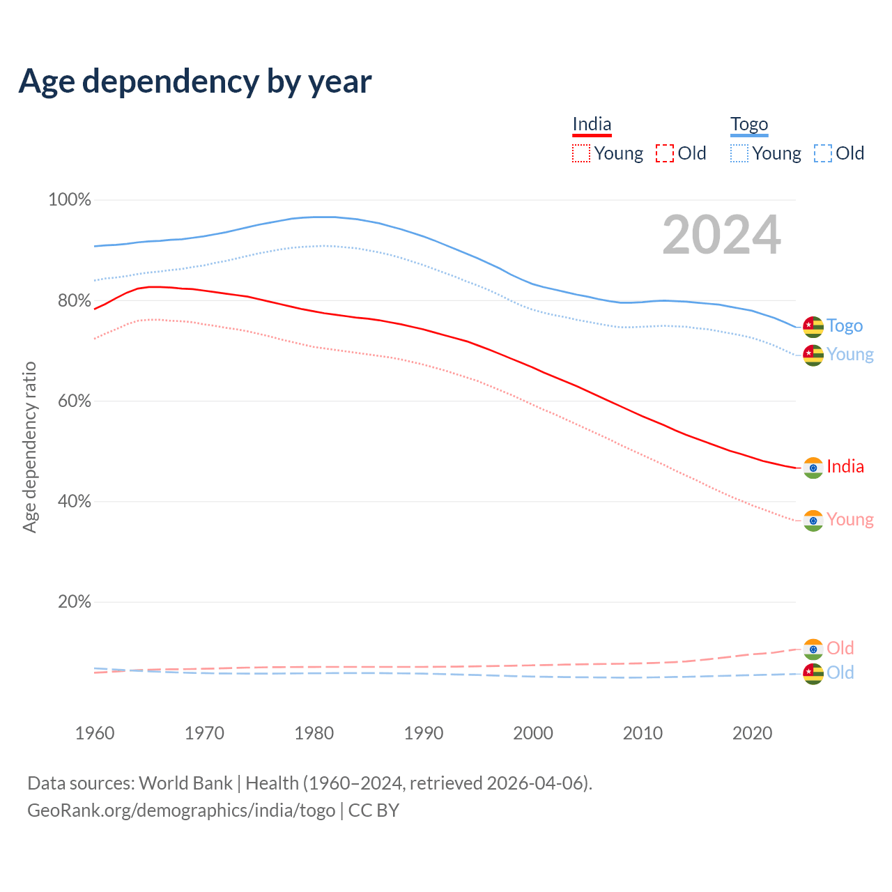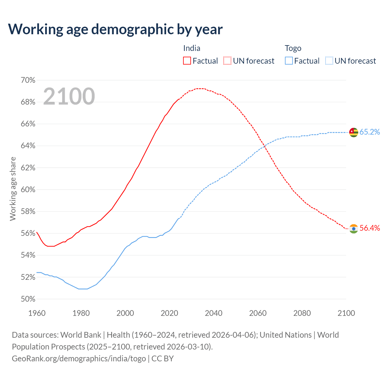 The share of older people aged 65 and over is 7.15% in India and 3.21% in Togo. Life expectancy in India compared to Togo .