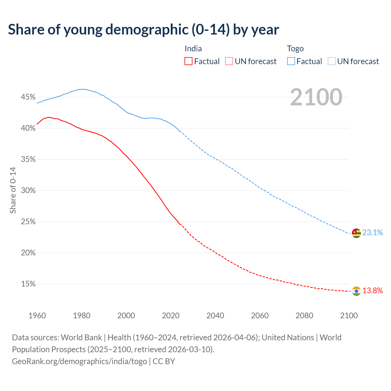 - The share of young demographic (0-15 years old) in India is 24.6% vs 39.5% in Togo.