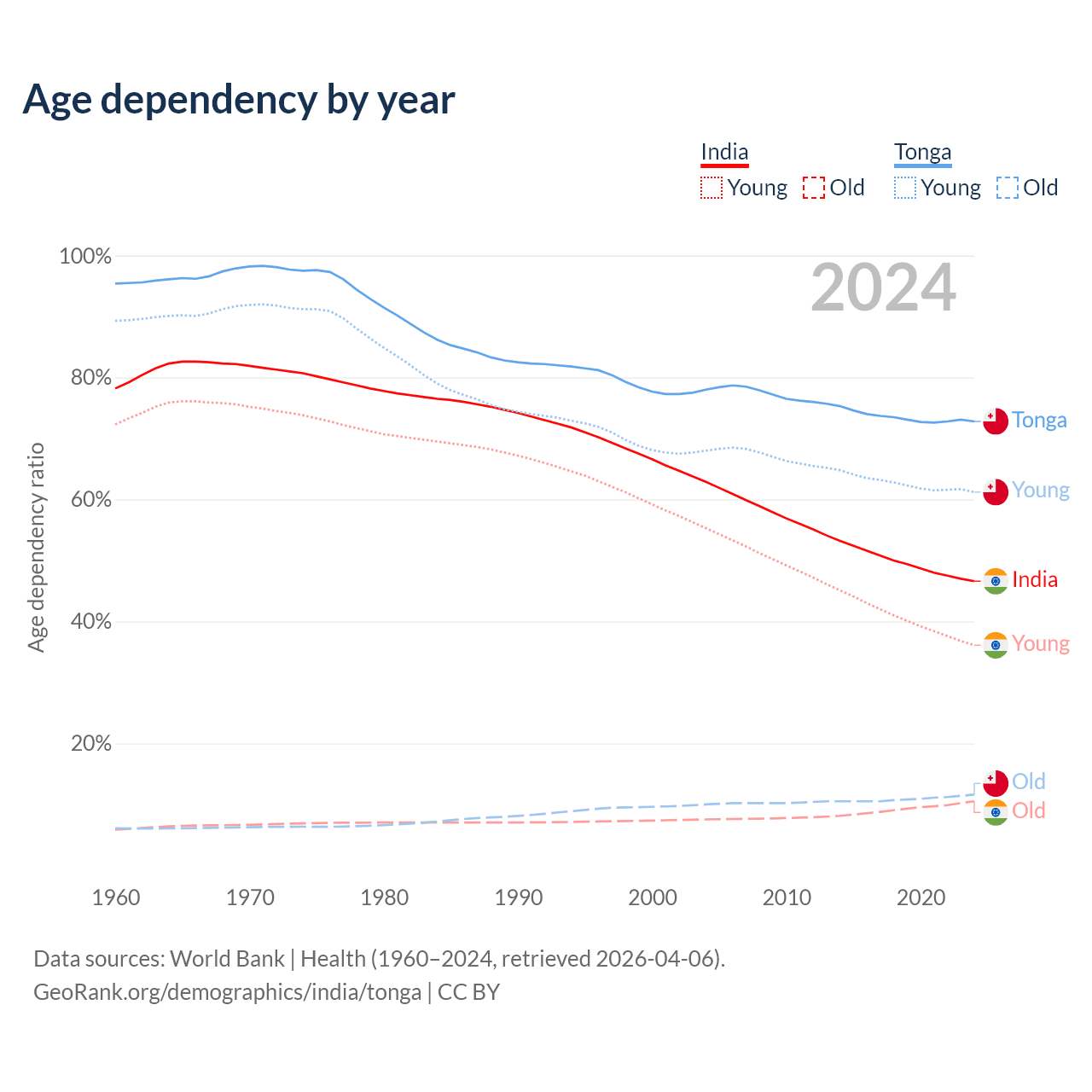 - India is ranked 108/196 by median age (oldest to youngest) vs 149/196 for Tonga.