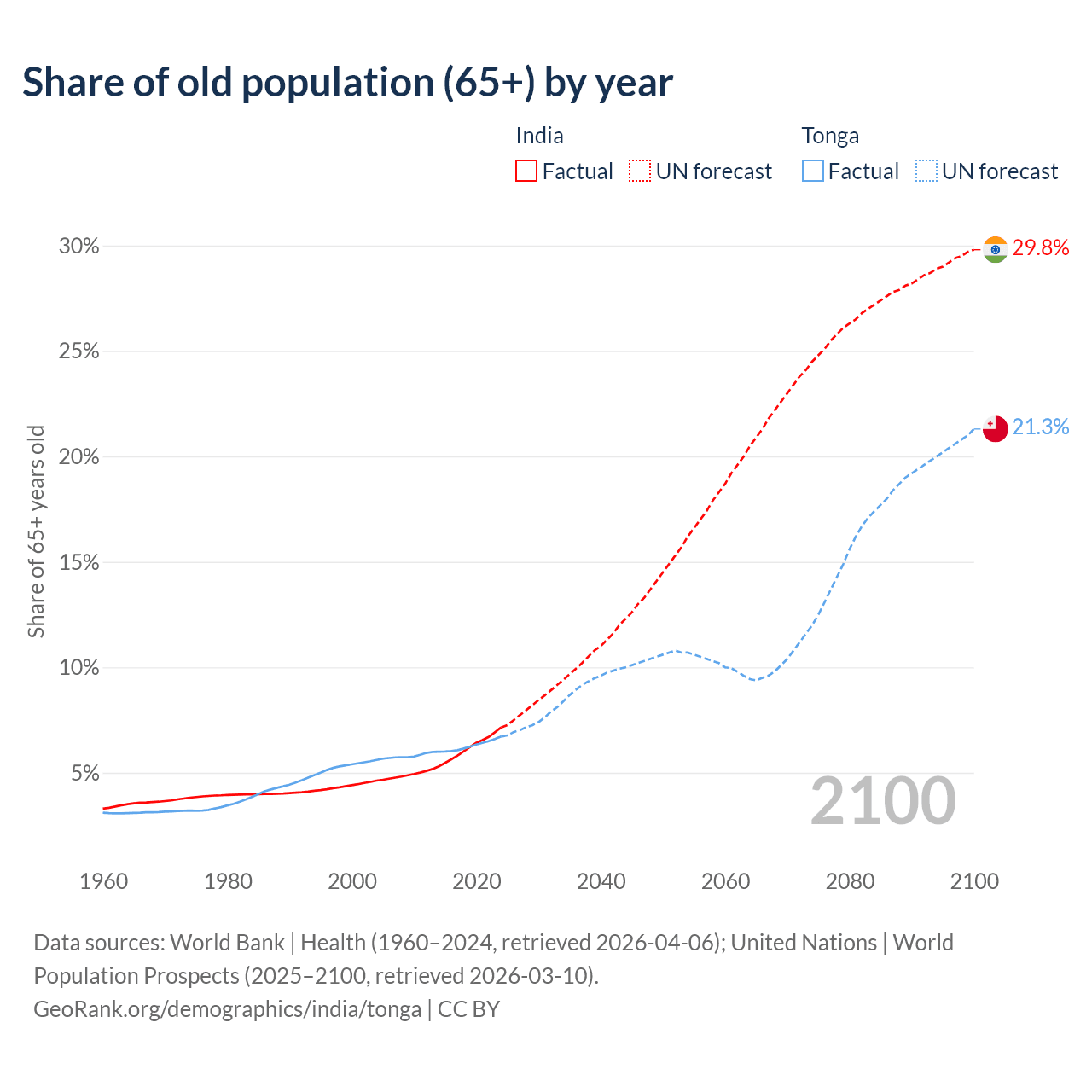 The share of older people aged 65 and over is 7.15% in India and 6.72% in Tonga. Life expectancy in India compared to Tonga .