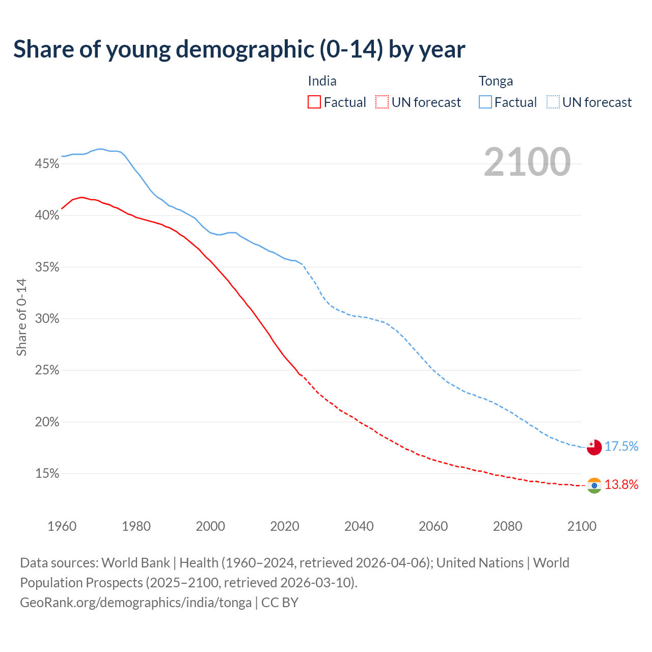- The share of young demographic (0-15 years old) in India is 24.6% vs 35.4% in Tonga.