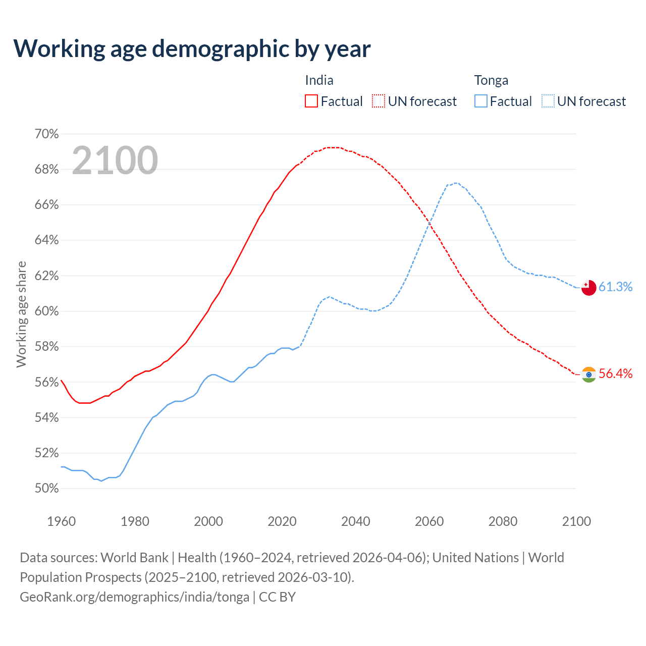 - India has 1.01B working age adults (aged 15-64) vs 59.8K in Tonga.