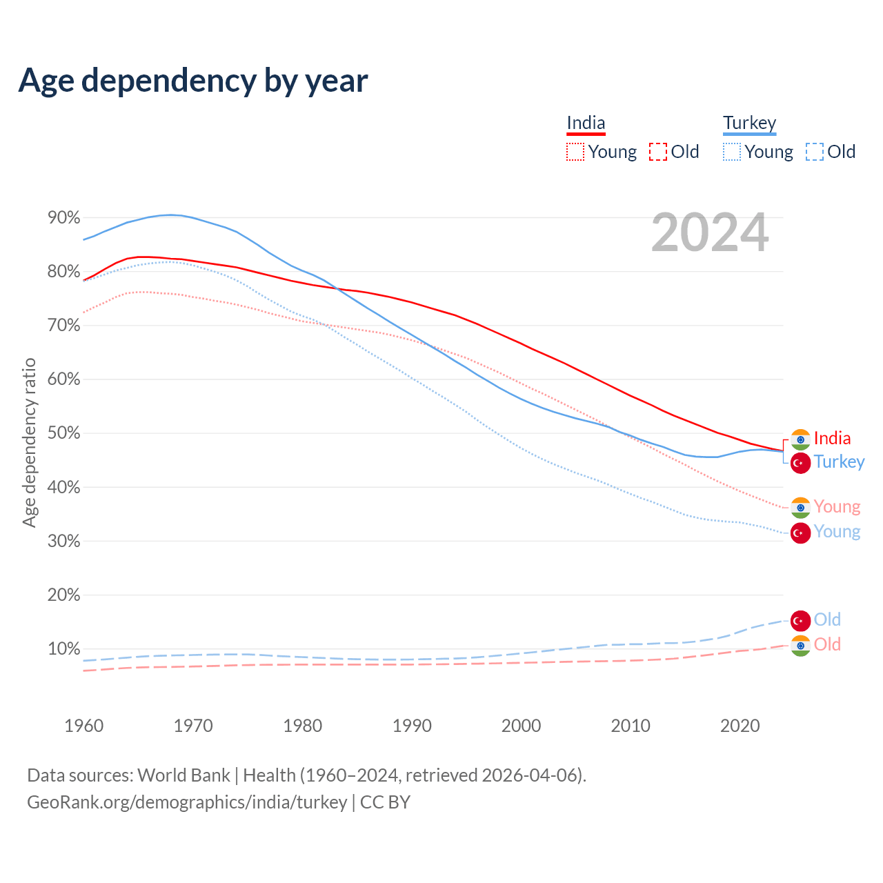 - India is ranked 108/196 by median age (oldest to youngest) vs 83/196 for Turkey.