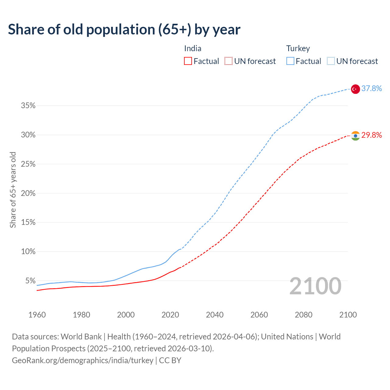 The share of older people aged 65 and over is 7.15% in India and 10.3% in Turkey. Life expectancy in India compared to Turkey .