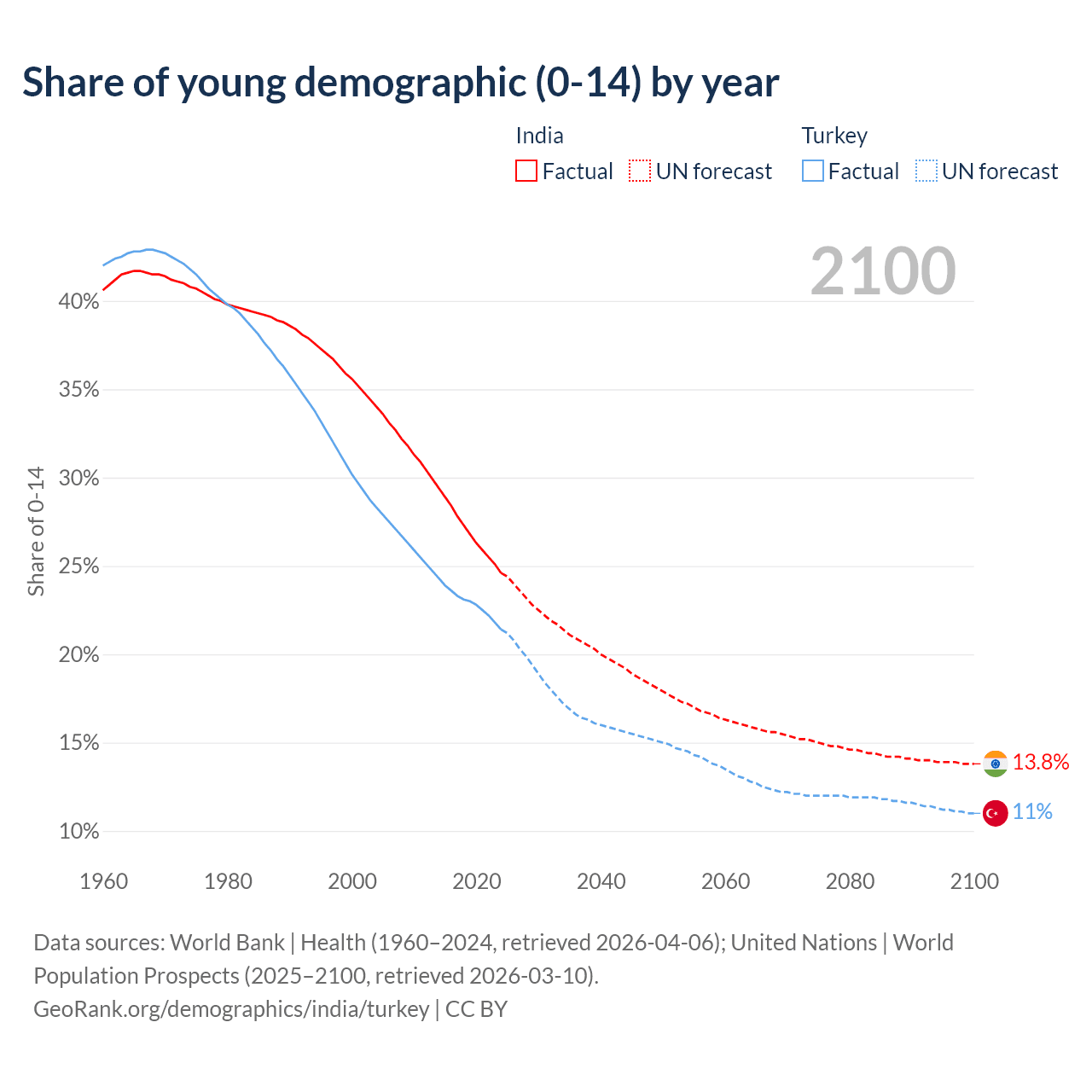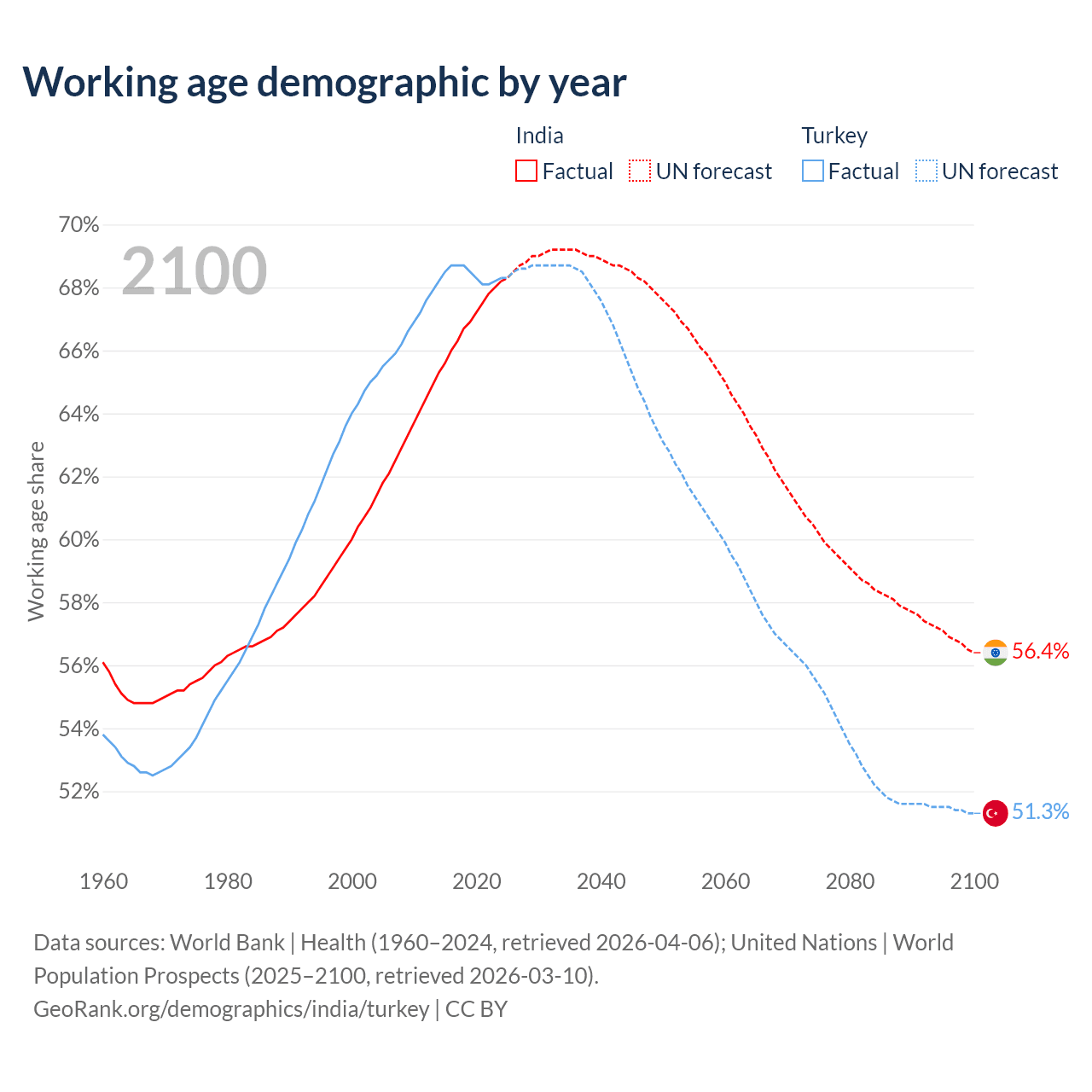 Median age India vs Turkey, 1960-2100