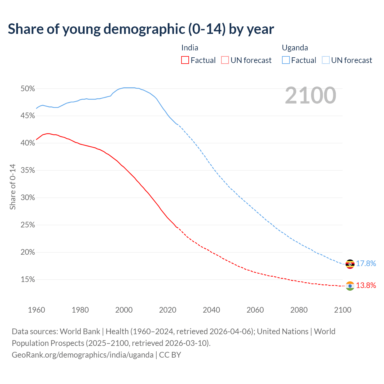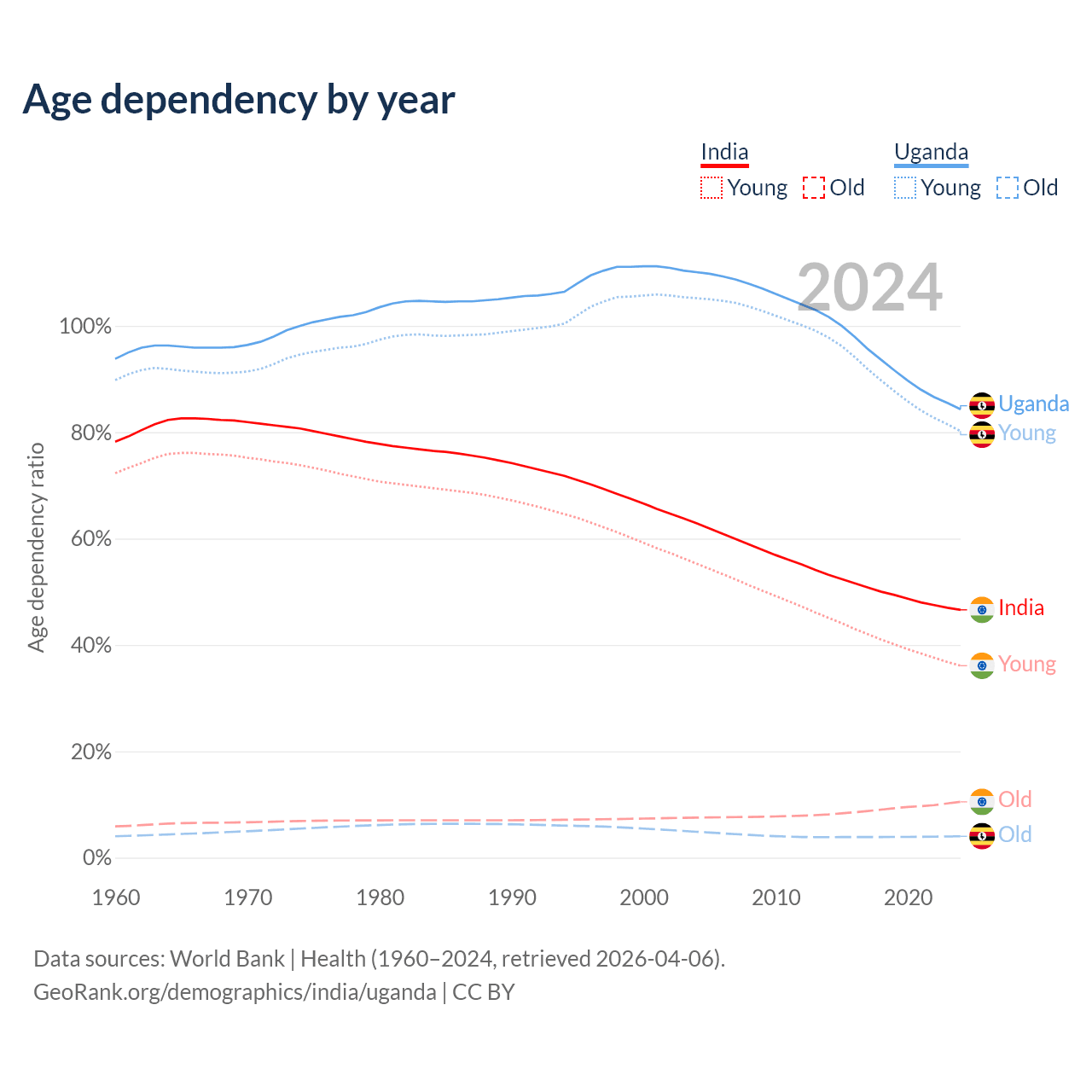 - India is ranked 108/196 by median age (oldest to youngest) vs 187/196 for Uganda.