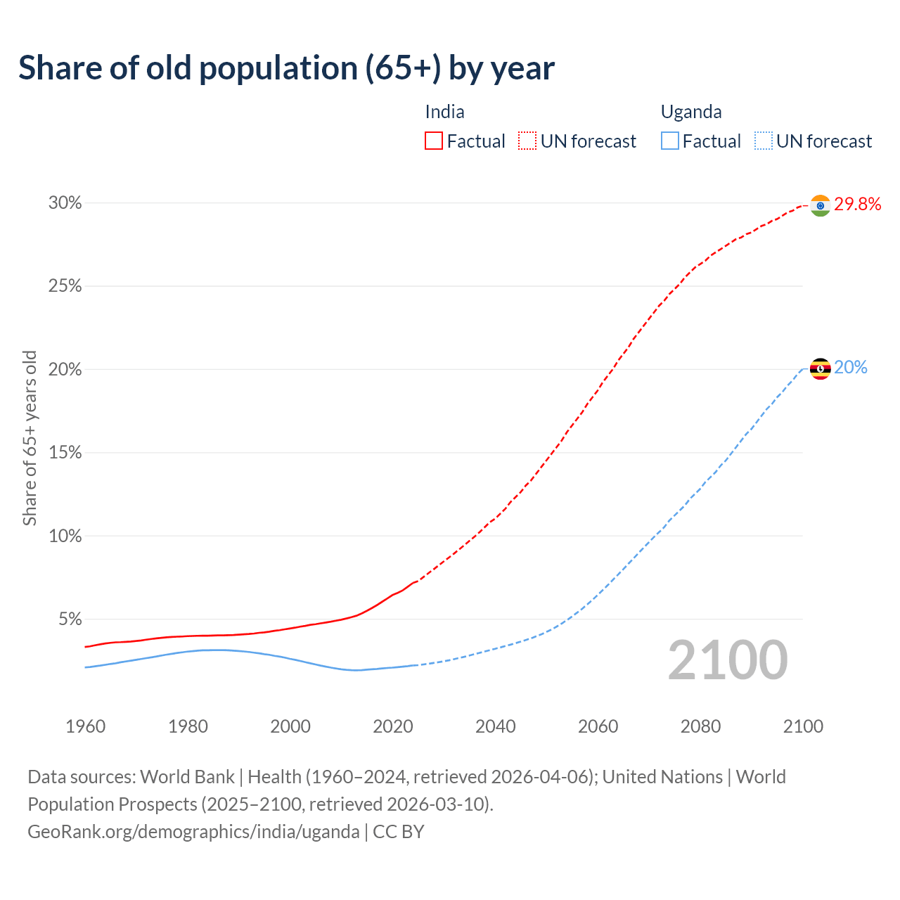 The share of older people aged 65 and over is 7.15% in India and 2.19% in Uganda. Life expectancy in India compared to Uganda .