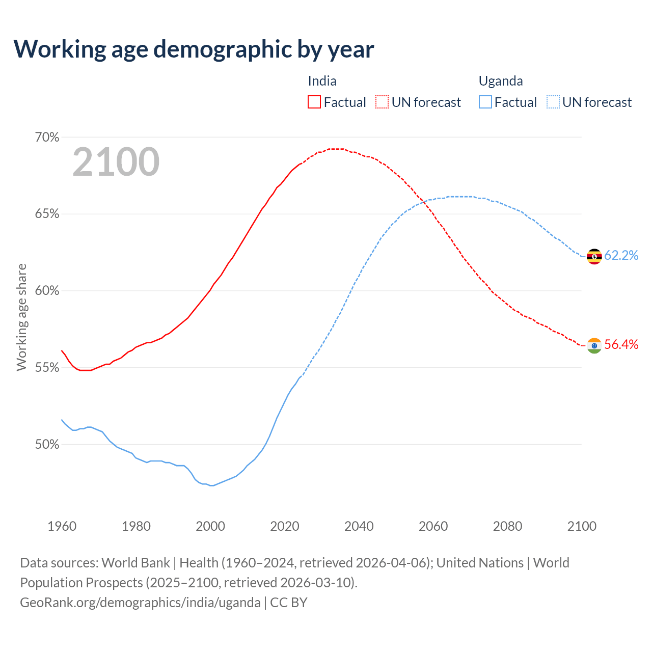 - India has 1.01B working age adults (aged 15-64) vs 28.9M in Uganda.