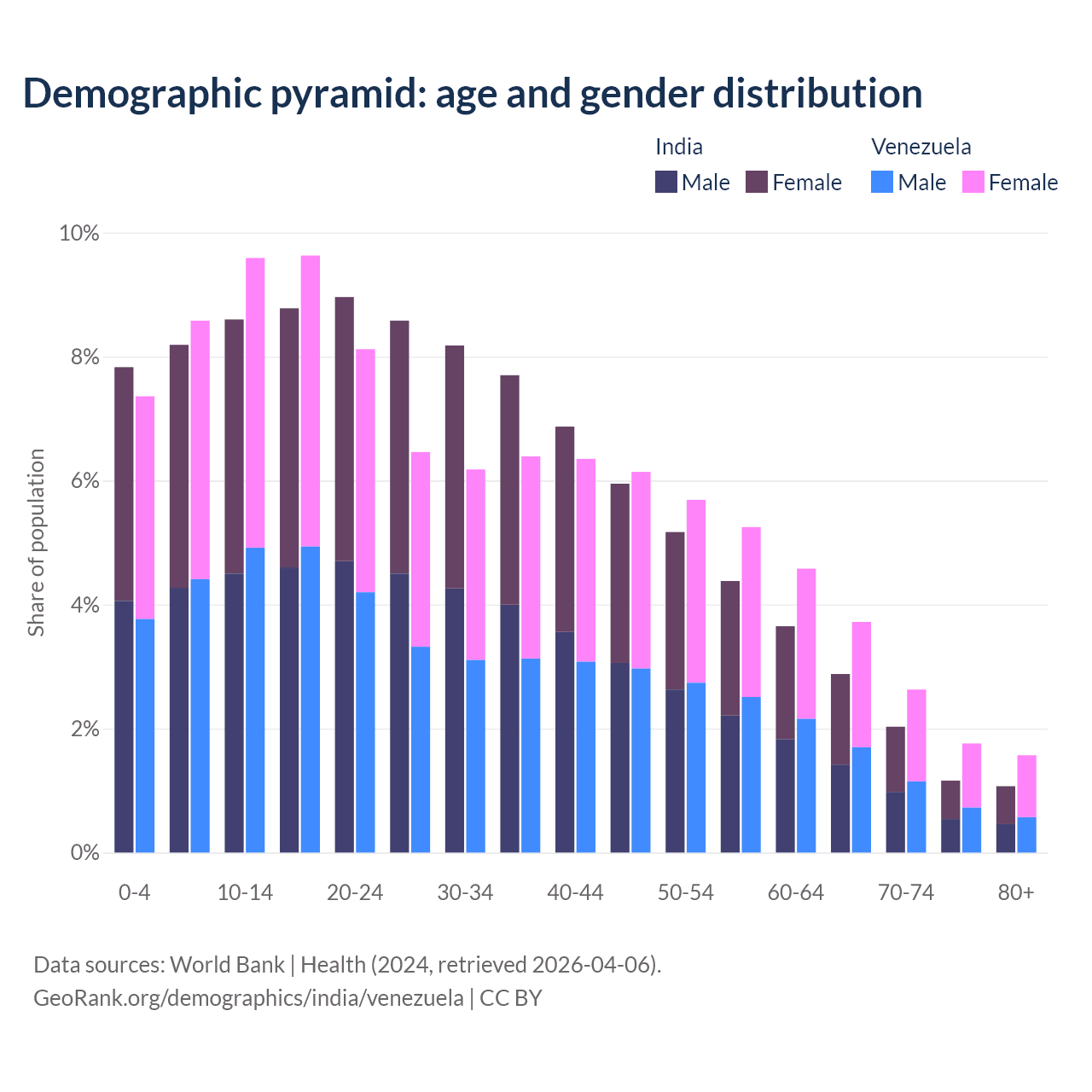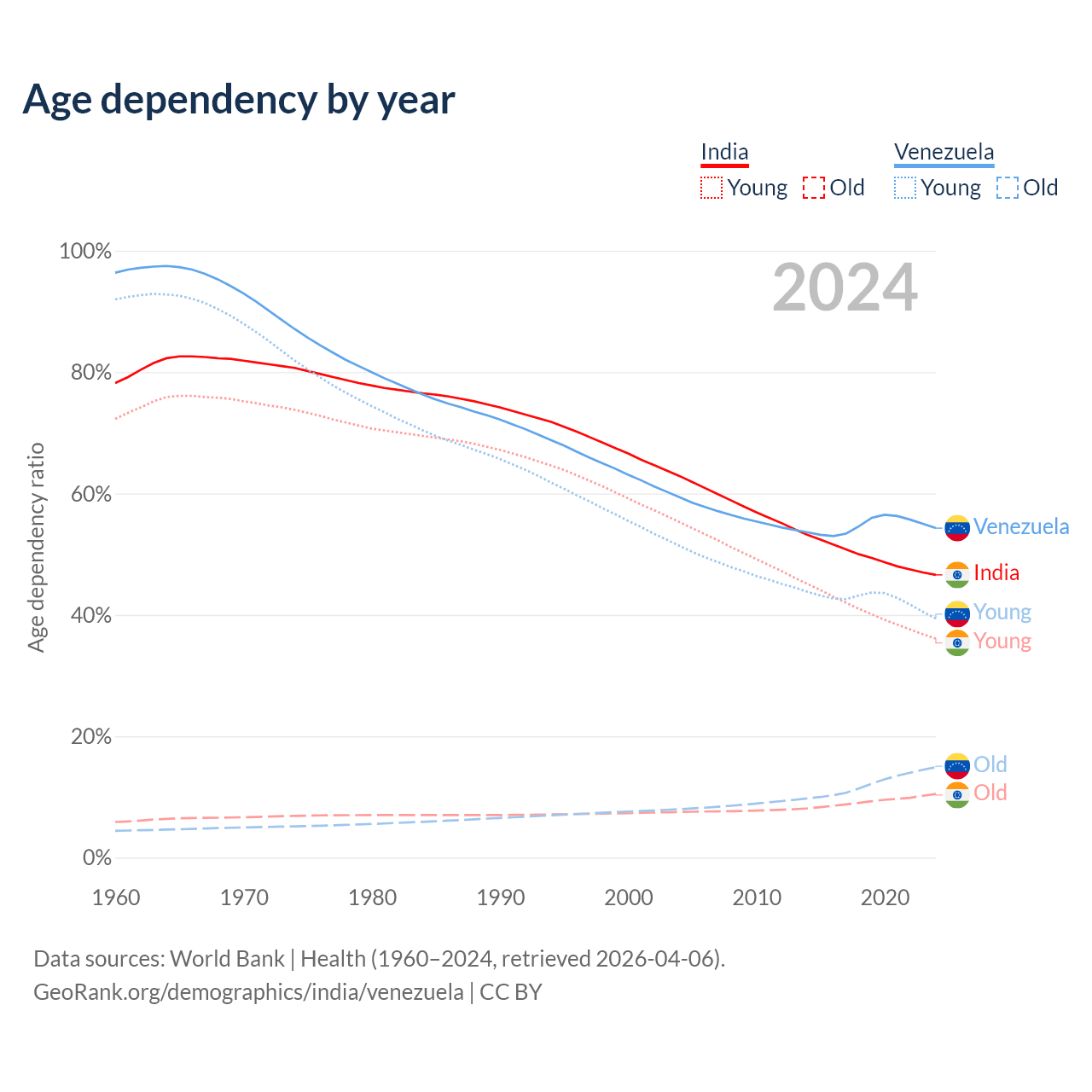 - India is ranked 108/196 by median age (oldest to youngest) vs 104/196 for Venezuela.