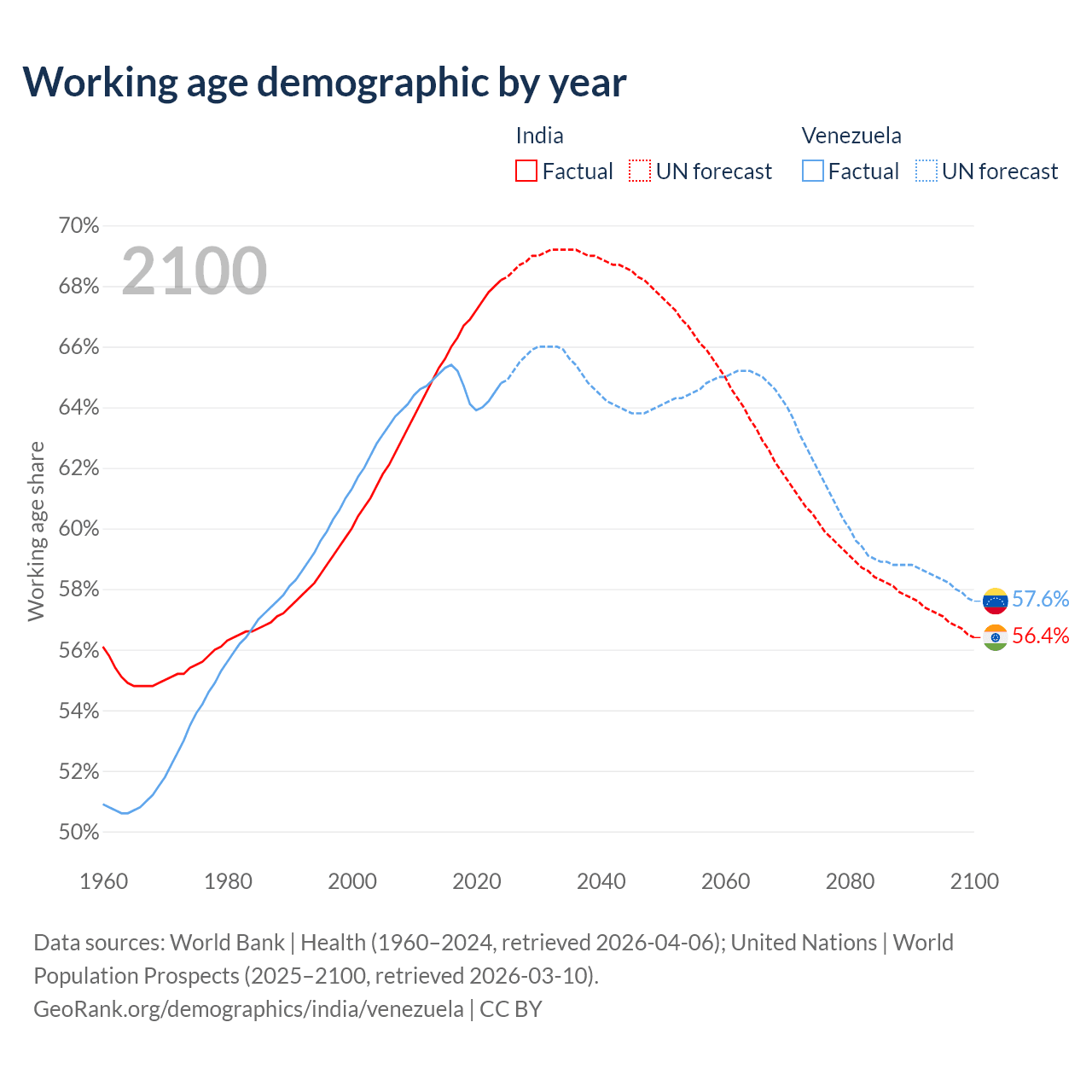 - India has 1.01B working age adults (aged 15-64) vs 18.6M in Venezuela.