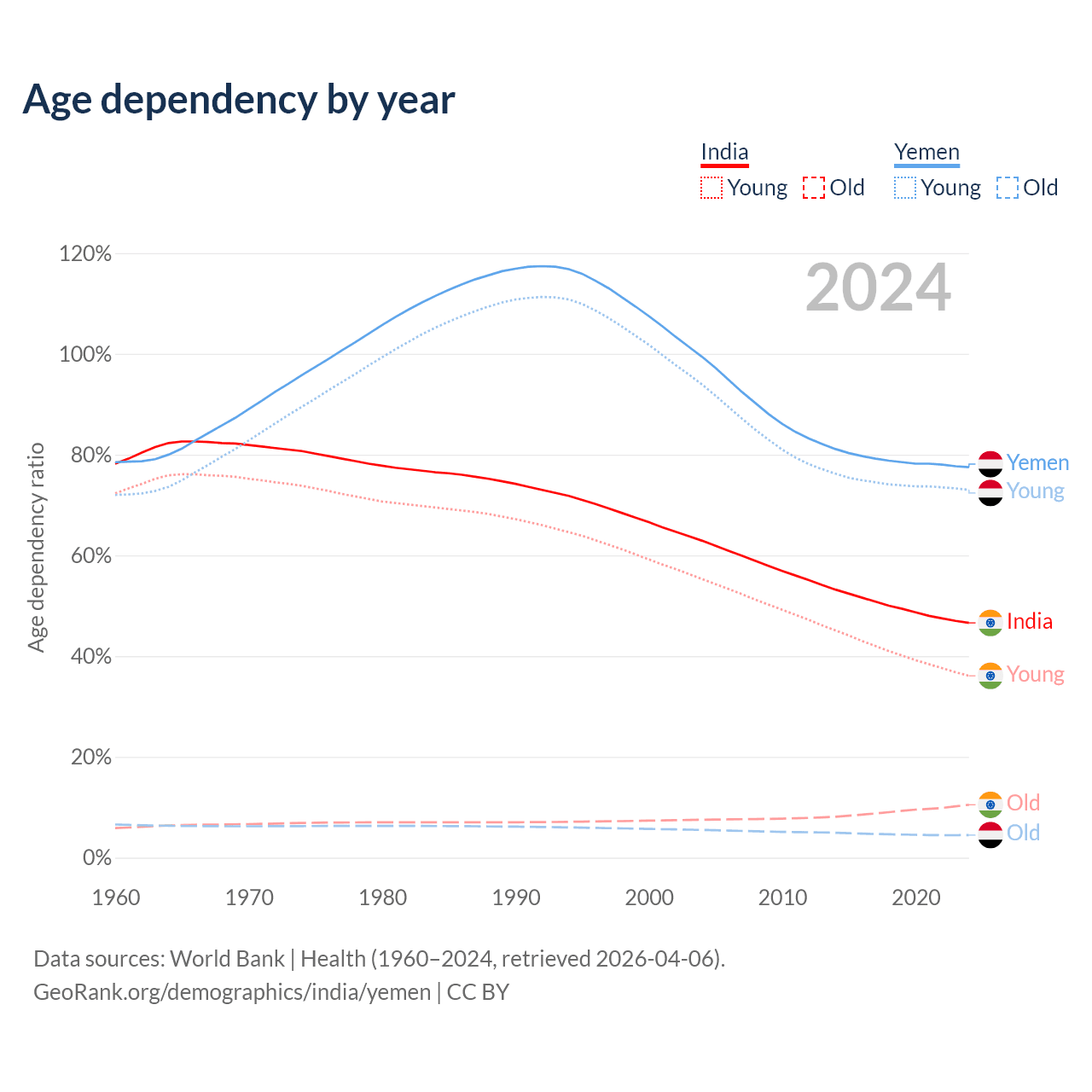 - India is ranked 108/196 by median age (oldest to youngest) vs 174/196 for Yemen.