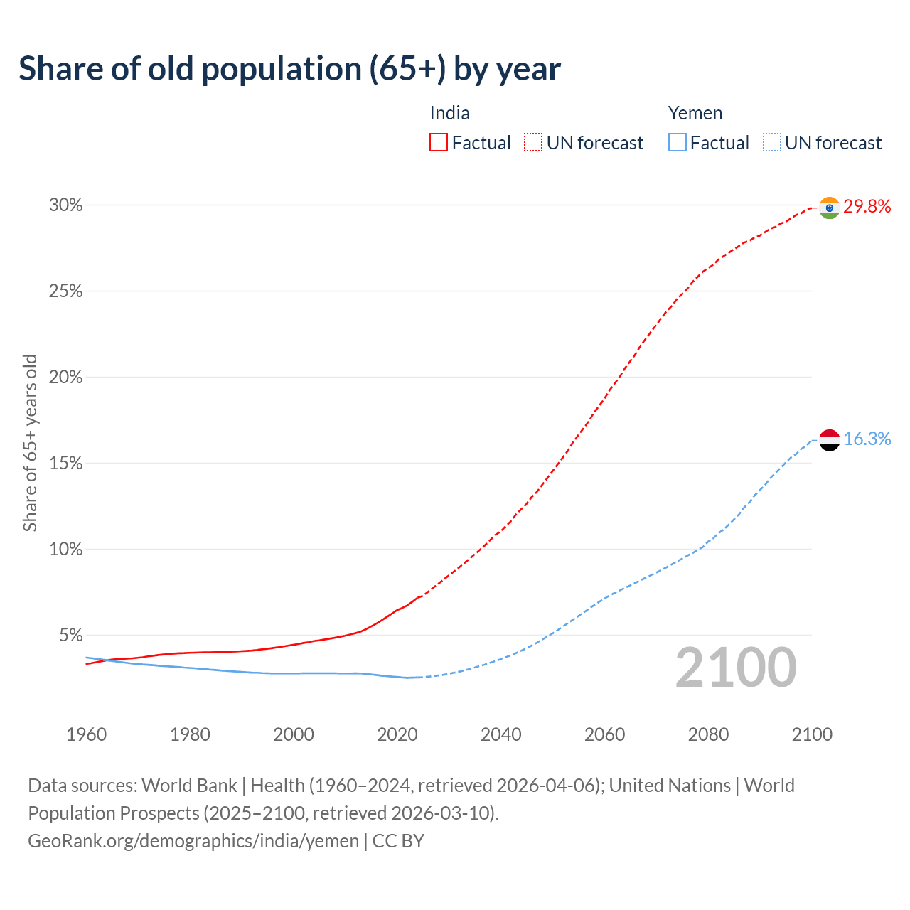 The share of older people aged 65 and over is 7.15% in India and 2.52% in Yemen. Life expectancy in India compared to Yemen .