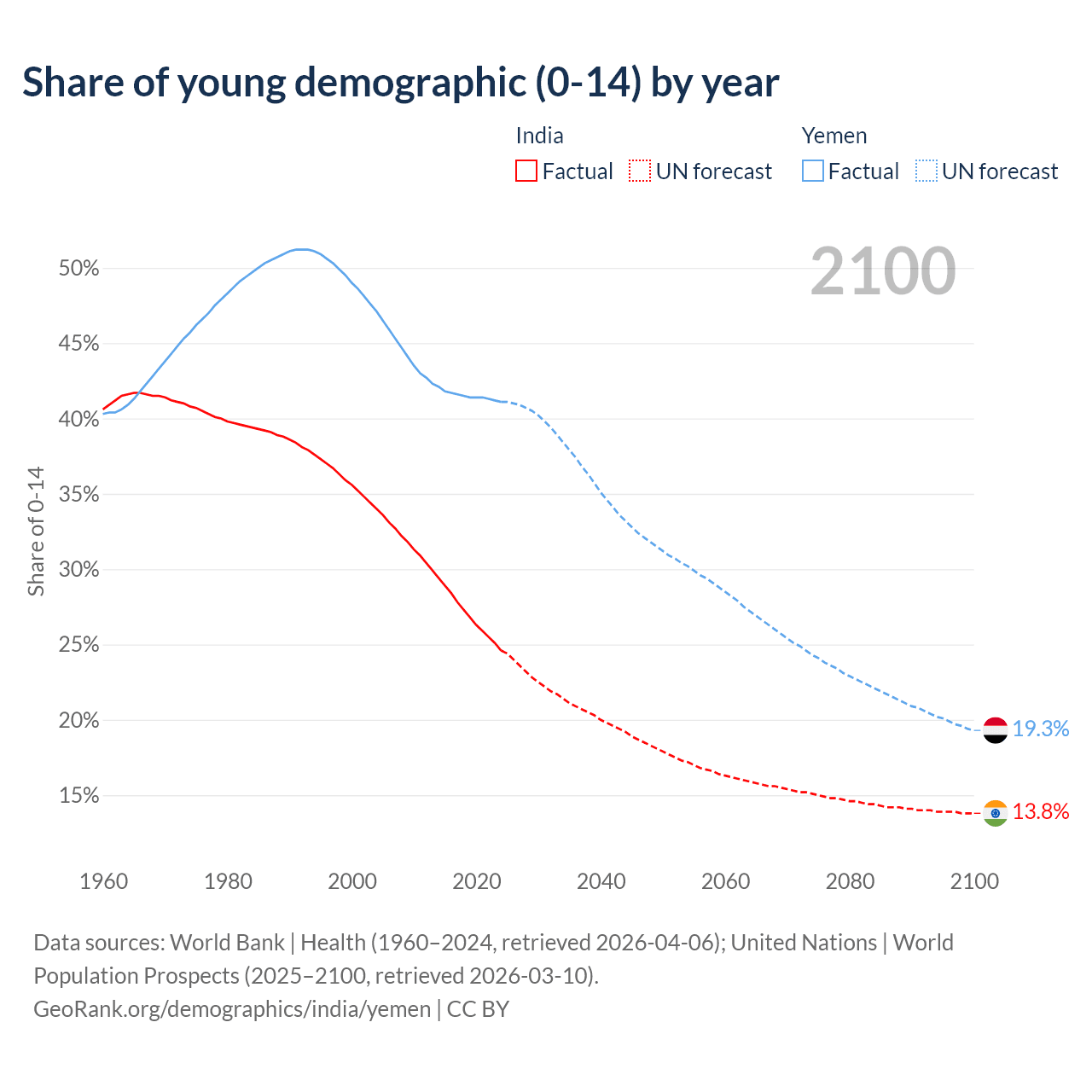 - The share of young demographic (0-15 years old) in India is 24.6% vs 41.1% in Yemen.