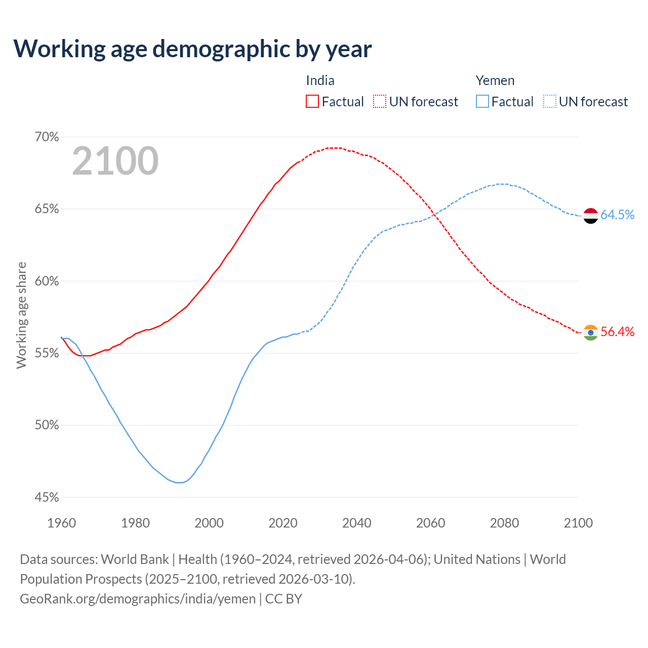 - India has 1.01B working age adults (aged 15-64) vs 24.4M in Yemen.