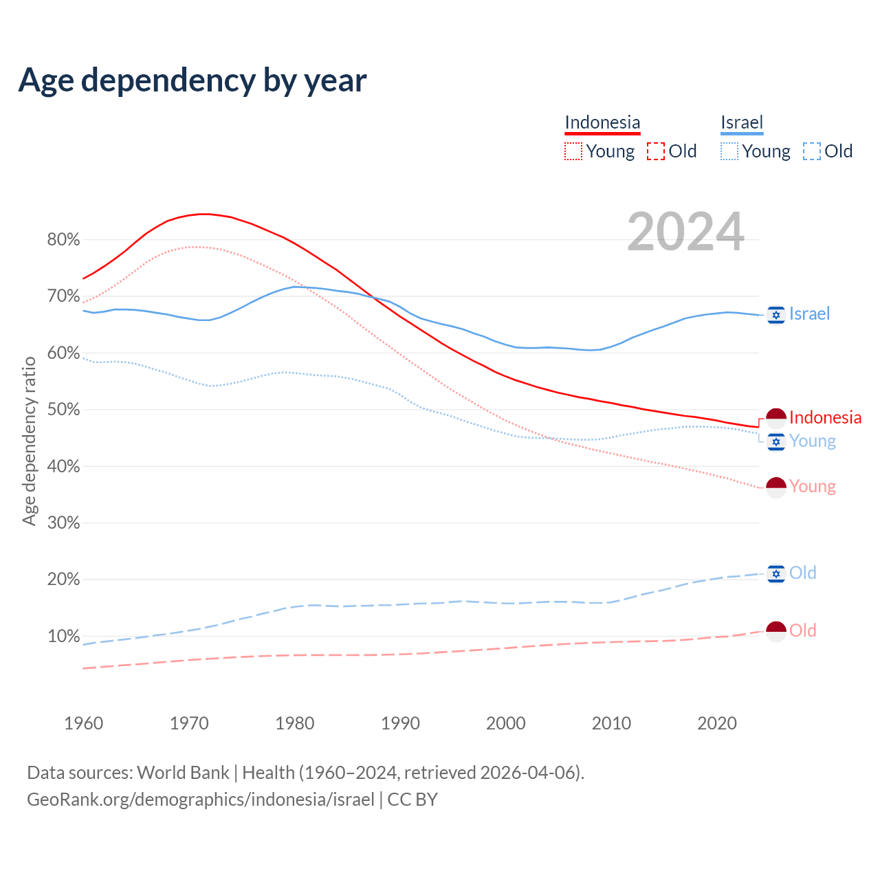 - Indonesia is ranked 93/196 by median age (oldest to youngest) vs 103/196 for Israel.