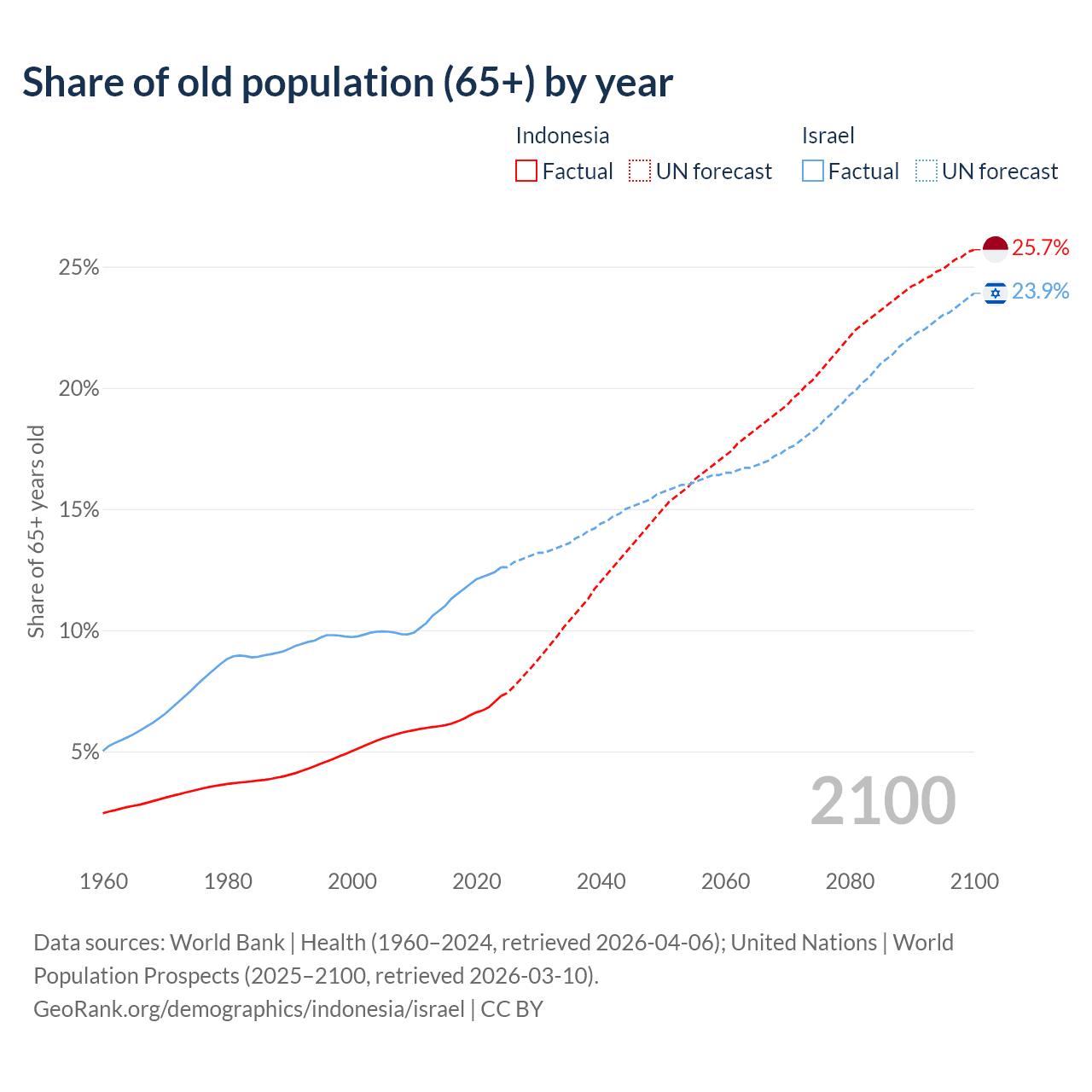 The share of older people aged 65 and over is 7.29% in Indonesia and 12.6% in Israel. Life expectancy in Indonesia compared to Israel .