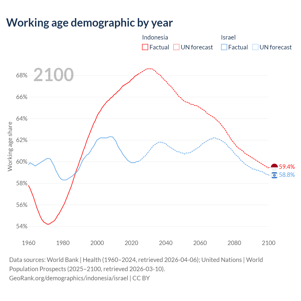 Median age Indonesia vs Israel, 1960-2100