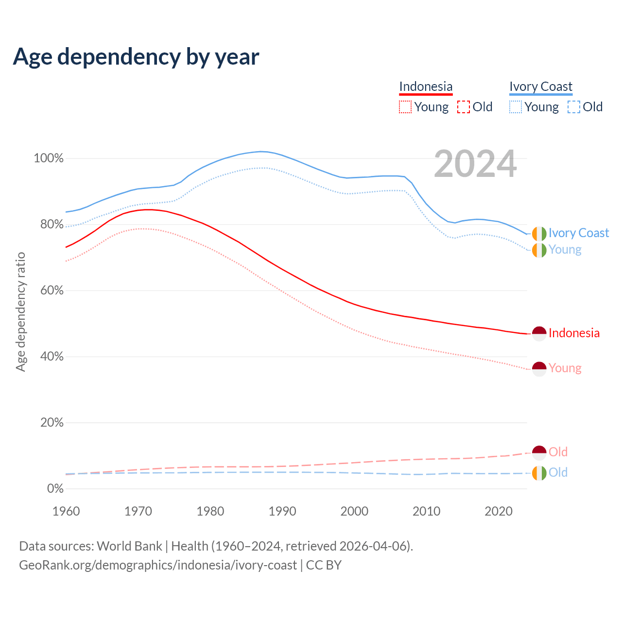 - Indonesia is ranked 93/196 by median age (oldest to youngest) vs 175/196 for Ivory Coast.