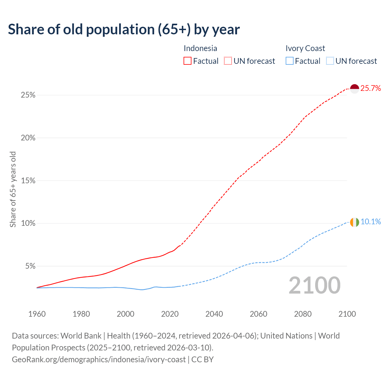 - The share of old-age demographic (65+) in Indonesia is 7.29% vs 2.61% in Ivory Coast.