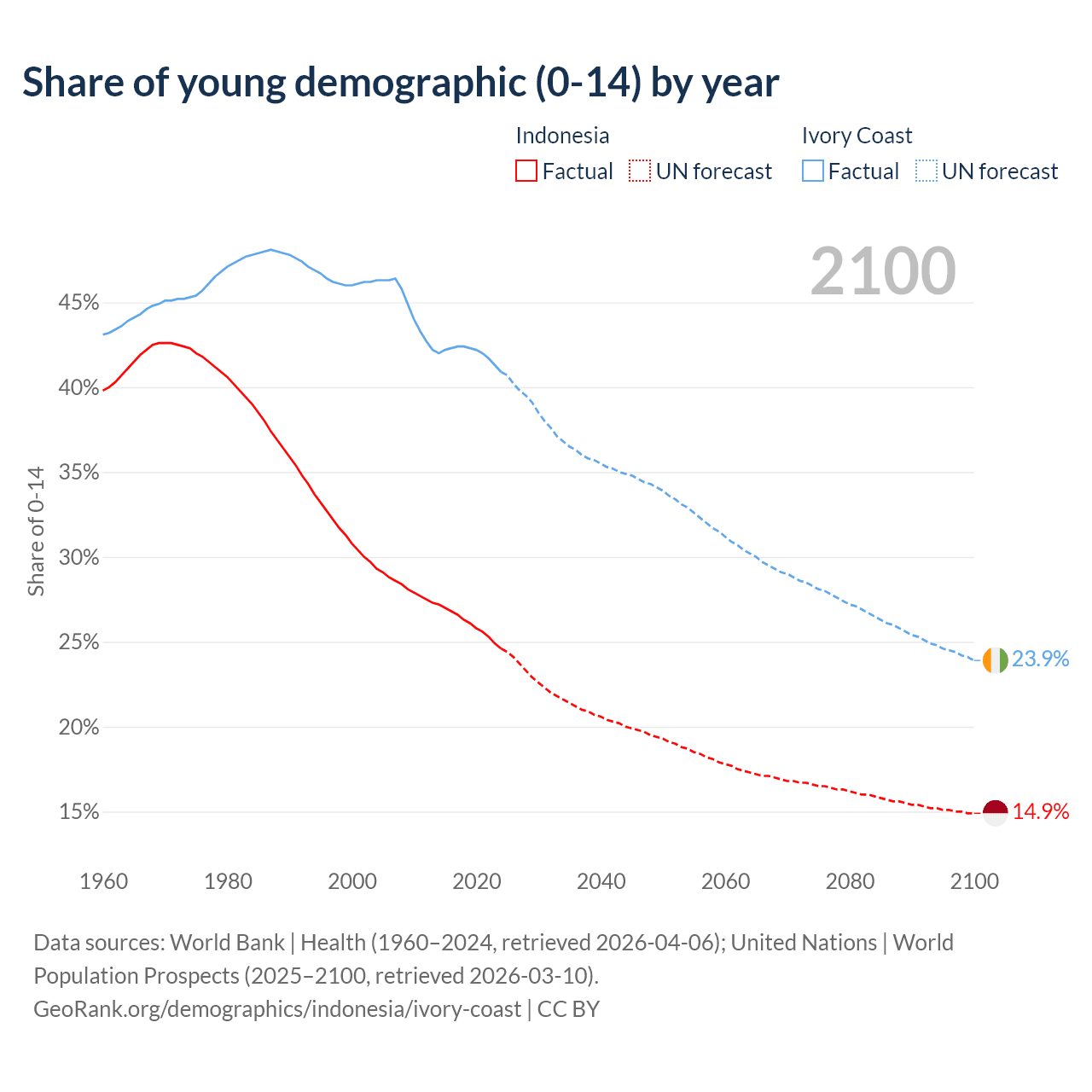- The share of young demographic (0-15 years old) in Indonesia is 24.6% vs 40.9% in Ivory Coast.