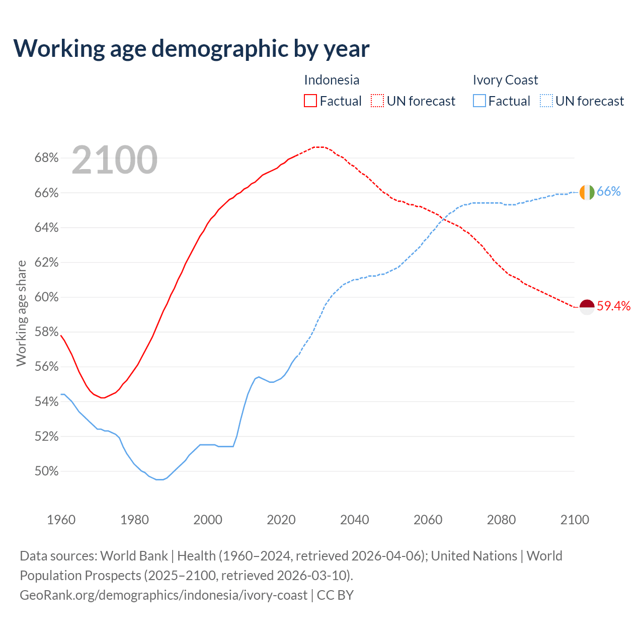 - Indonesia has 197M working age adults (aged 15-64) vs 19.1M in Ivory Coast.
