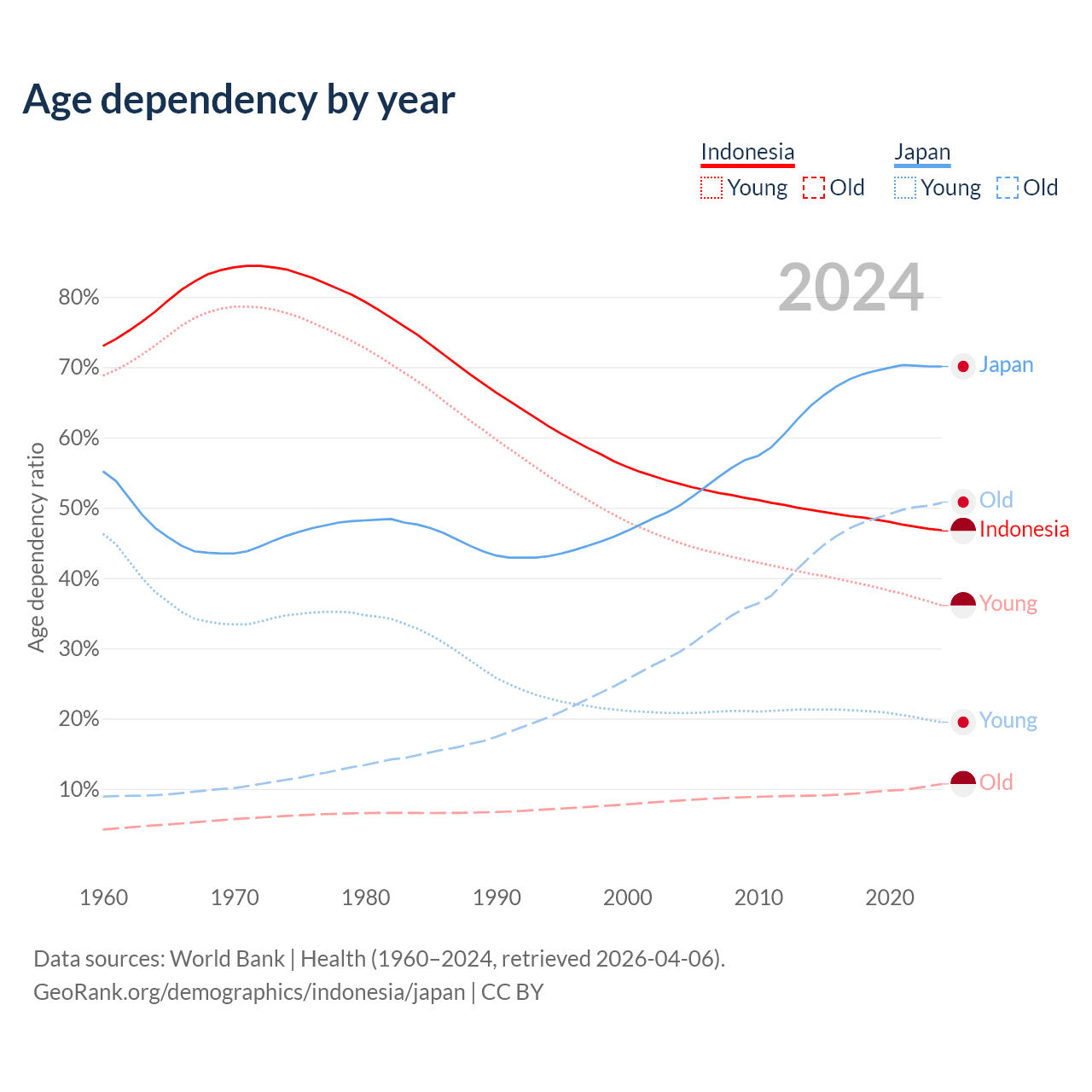 - Indonesia is ranked 93/196 by median age (oldest to youngest) vs 2/196 for Japan.