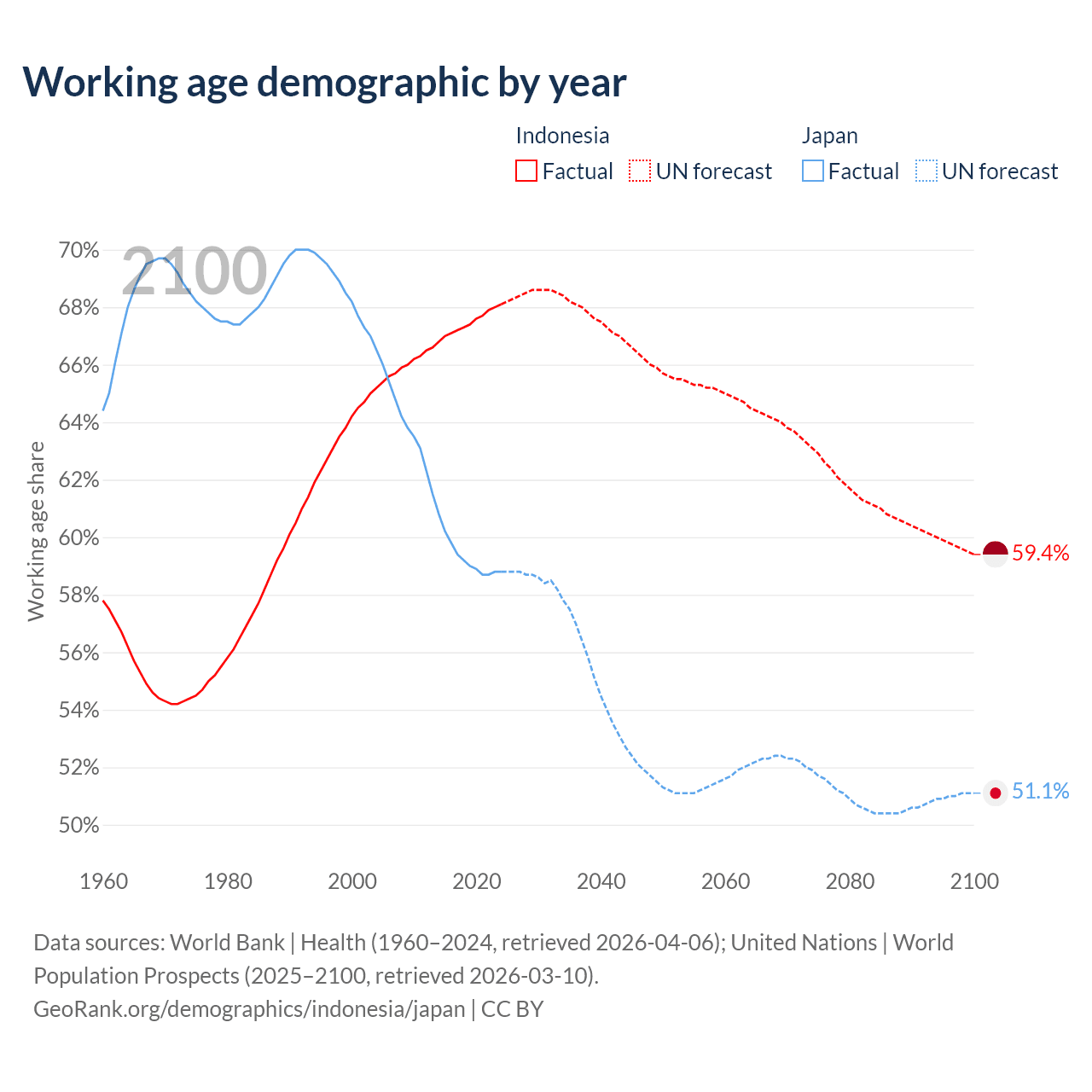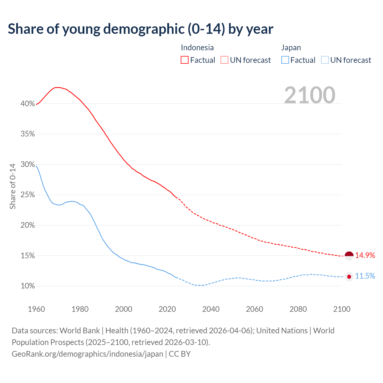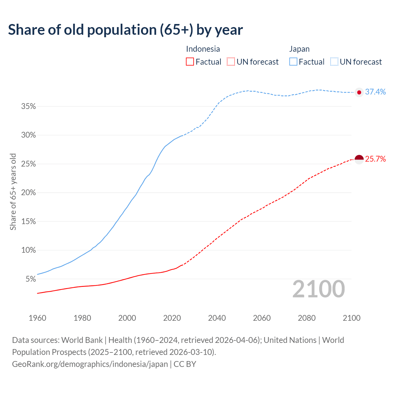 Median age Indonesia vs Japan, 1960-2100